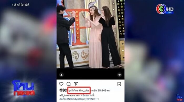 ด้านทางรายการ 3แซ่บ ลงคลิปสดๆตอน แอฟ กำลังดูรายการโหนกระแส ขณะ หนุ่ม กรรชัย สัมภาษณ์ ทิม พิธา โดย แอฟ ทวนคำตอบ ทิม บอกว่า เห็นกันมานาน พี่หนุ่มถามอะไรค่ะ พวกเราดูกันอยู่นะคะ เบาๆนะคะ