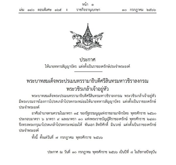 ทั้งนี้ ตั้งแต่วันที่ 7 กรกฎาคม พุทธศักราช 2566 ประกาศ ณ วันที่ 10 กรกฎาคม พุทธศักราช 2566 เป็นปีที่ 8 ในรัชกาลปัจจุบัน