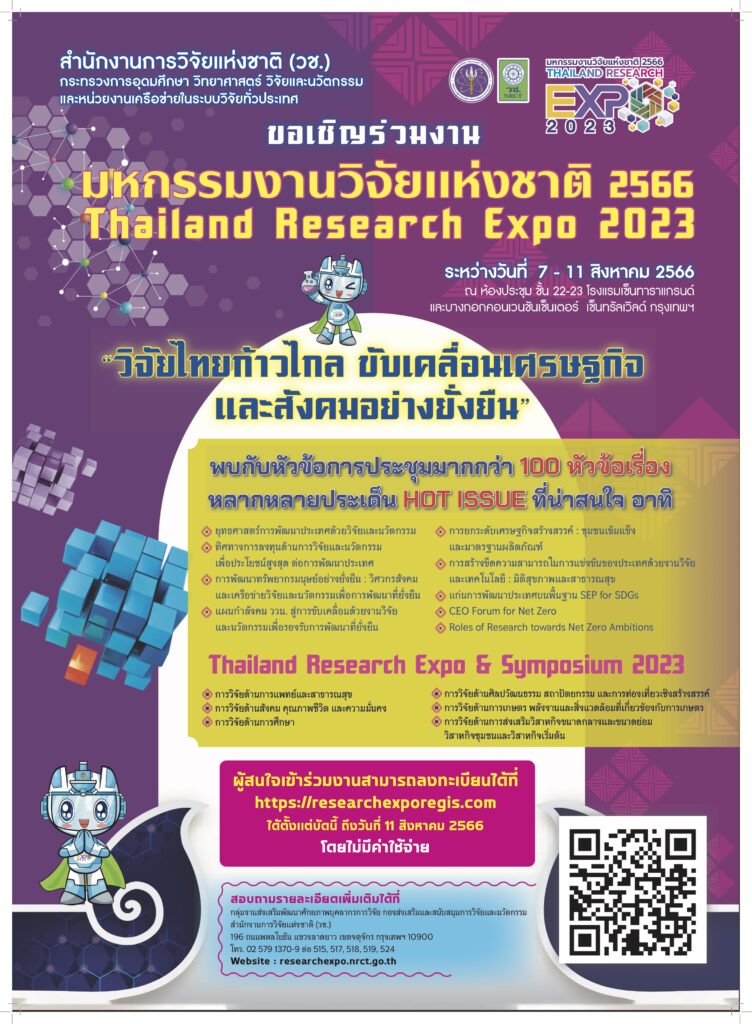 วช. ขอเชิญชวนนิสิต นักศึกษา และประชาชนทั่วไป เข้าชมงาน “มหกรรมงานวิจัยแห่งชาติ 2566หรือ Thailand Research Expo2023 ที่จะจัดขึ้นระหว่างวันที่ 7-11 สิงหาคม 2566 เวลา 09.00–17.00 น. ณ ห้องประชุมชั้น 22-23 โรงแรมเซ็นทาราแกรนด์ และบางกอกคอนเวนชั่นเซ็นเตอร์ เซ็นทรัลเวิลด์ กรุงเทพ ผู้สนใจศึกษารายละเอียดเพิ่มเติมได้ที่ www.researchexpo.go.th