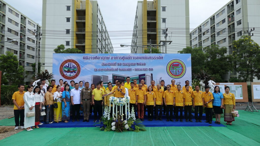 บรรยากาศภายในพิธีมี พระครูปลัดสุวัฒนวิสุทธิสารคุณ เจ้าอาวาสวัดเทพสรธรรมาราม ตำบลบ้านใหม่ อำเภอเมือง จังหวัดปทุมธานี เป็นประธานฝ่ายสงฆ์ โดยมี นายสกล สุนทรวาณิชย์กิจ สมาชิกสภาผู้แทนราษฎรจังหวัดปทุมธานี เขต 4 นายนภเดช เกลียวศิริกุล นายอำเภอธัญบุรี และนายแพทย์อภิชน จีนเสวก รองนายแพทย์สาธารณสุขจังหวัดปทุมธานี รวมพิธีวางศิลาฤกษ์ และพิธียกเสาเอก เสาโท ศูนย์การแพทย์นครรังสิต เพื่อรองรับการบริการประชาชนในอนาคต ภายในงานยังมีซุ้มอาหารและน้ำดื่มจากกลุ่มผู้น้ำชุมชนมาเลี้ยงผู้ที่มาร่วมพิธีฟรี