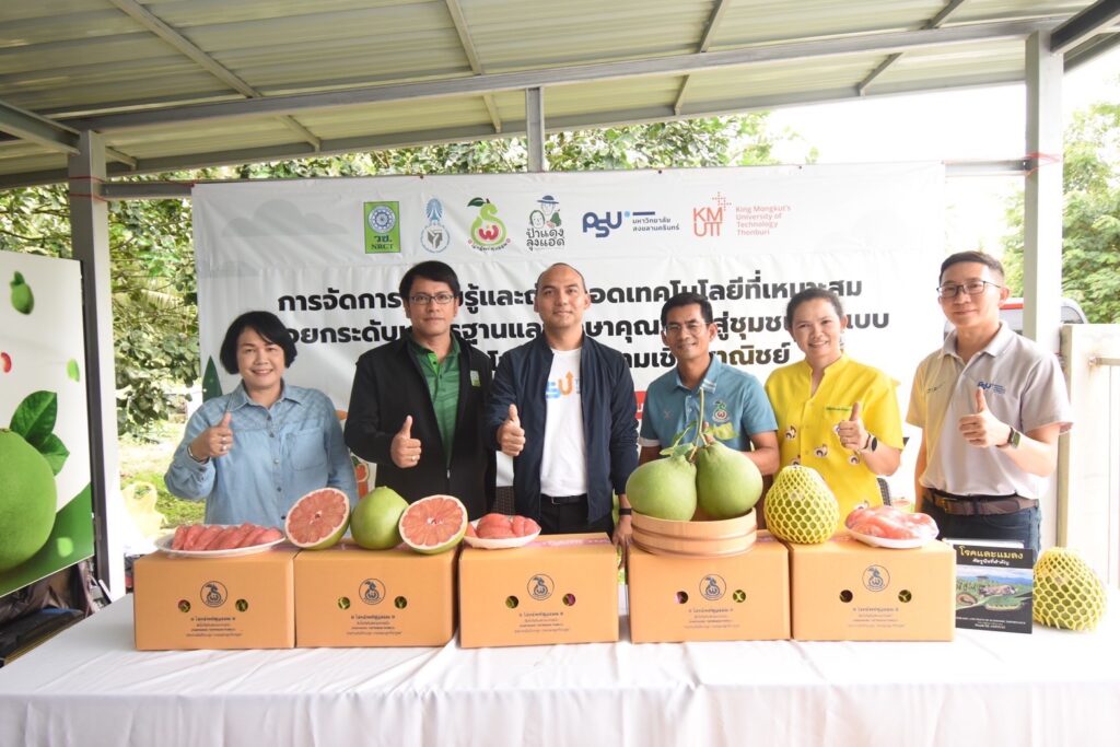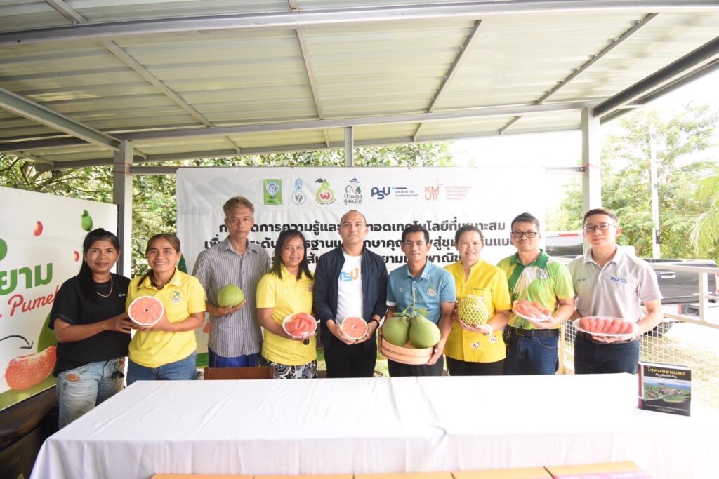 รศ.ดร.สมัคร แก้วสุกแสง รองอธิการบดีฝ่ายวิจัยและนวัตกรรม มหาวิทยาลัยทักษิณ หัวหน้าโครงการฯ กล่าวว่า (วช.) ได้สนับสนุนทุนวิจัย โครงการ “การจัดการความรู้และถ่ายทอดเทคโนโลยีที่เหมาะสมเพื่อยกระดับมาตรฐานและรักษาคุณภาพสู่ชุมชนต้นแบบการผลิตส้มโอทับทิมสยามเชิงพาณิชย์” เพื่อถ่ายทอดเทคโนโลยีการจัดการก่อนและหลังการเก็บเกี่ยวเพื่อรักษาคุณภาพและการยืดอายุการเก็บรักษาส้มโอทับทิมสยาม สำหรับตลาดในประเทศและส่งออกให้กับกลุ่มเกษตรกร ชุมชนผู้ผลิตและบริษัทภาคเอกชนในพื้นที่อำเภอปากพนัง จังหวัดนครศรีธรรมราช รวมถึง พัฒนาคุณภาพส้มโอทับทิมสยามให้ได้มาตรฐานสำหรับตลาดในประเทศ Modern Trade และส่งออก สร้าง Learning and Innovation Platform ชุมชนต้นแบบการผลิตและการจัดการหลังเก็บเกี่ยวของส้มโอทับทิมสยาม ที่มีคุณภาพสูงที่ปลูกในเชิงพาณิชย์ภายใต้กลุ่มสหกรณ์การเกษตรปากพนัง ที่มีการเชื่อมโยงกับระบบการตลาด Modern Trade นอกจากนี้ ยังได้พัฒนาทักษะการผลิตและการจัดการหลังการเก็บเกี่ยวของส้มโอทับทิมสยามเชิงพาณิชย์ให้กับบุคลากรทางการเกษตรในท้องที่อำเภอปากพนัง จังหวัดนครศรีธรรมราช