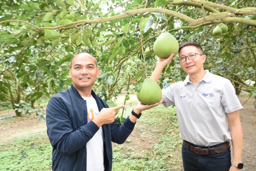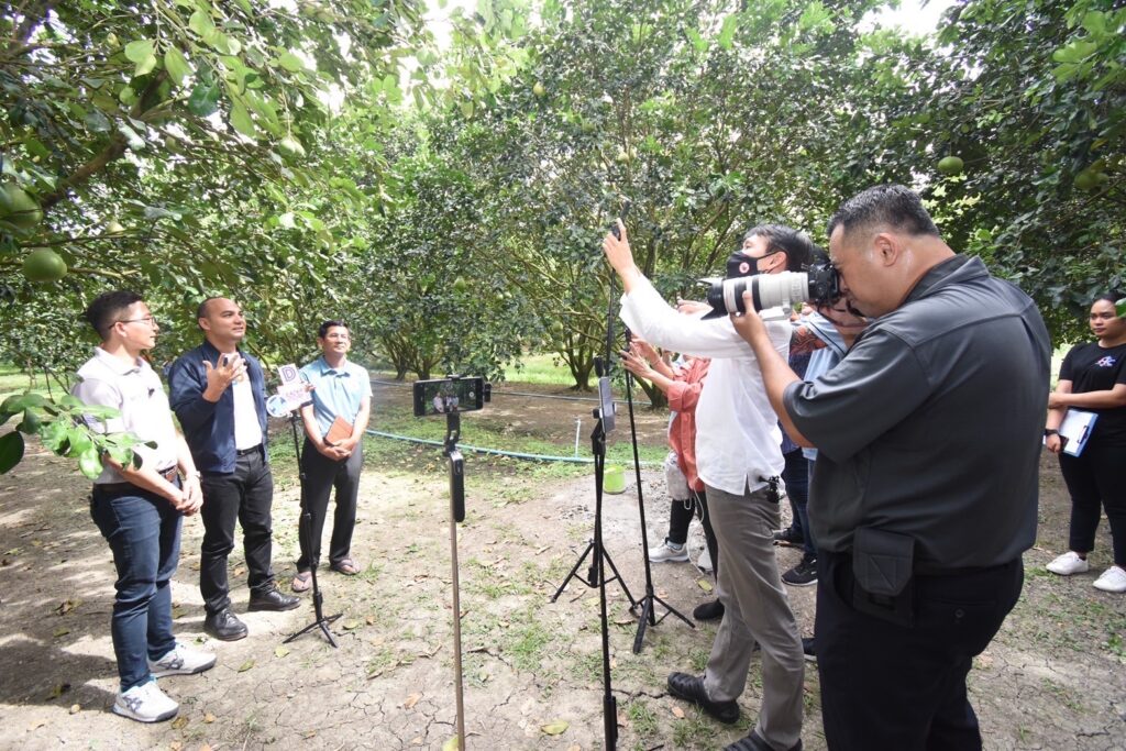 การลงพื้นที่ในครั้งนี้ คณะนักวิจัยได้นำสื่อมวลชมเยี่ยมชมนวัตกรรมการผลิตส้มโอทับทิมสยามจากโครงการวิจัยดังกล่าว ณ กลุ่มวิสาหกิจชุมชนแปลงใหญ่ส้มโอทับทิมสยามปากพนัง ไร่ทรัพย์สุวรรณ นำชมโดย คุณนริศ ช่วยแป้น แห่งไร่ทรัพย์สุวรรณ โดยสวนไร่ทรัพย์สวุวรรณแห่งนี้เน้นการผลิตส้มโอทับทิมสยามเพื่อการจำหน่ายในประเทศเป็นหลัก และเป็นหลักในการจัดตั้งกลุ่มวิสาหกิจชุมชนแปลงใหญ่ส้มโอทับทิมสยามปากพนังขึ้นมา และการเยี่ยมชมสวนส้มโอป้าแดง-ลุงแอ๊ด นำชมโดย คุณกมลทิพย์ กุลคง แห่งสวนส้มโอป้าแดง-ลุงแอ๊ด ซึ่งสวนแห่งนี้เน้นการผลิตส้มโอทับทิมสยามเพื่อการส่งออกไปยังจำหน่ายยังต่างประเทศเป็นหลัก โดยเฉพาะประเทศจีน มีความต้องการบริโภคส้มโอทับทิมสยามเป็นจำนวนมาก