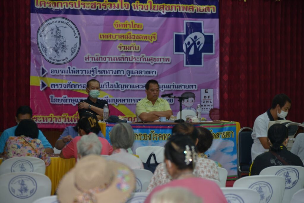 เมื่อวันที่ ๑๘ กรกฎาคม ๒๕๖๖ นายจำเริญ สละชีพ นายกเทศมนตรีเมืองลพบุรี พร้อมด้วย นายสมชัย อินปุระ รองนายกเทศมนตรีเมืองลพบุรี นายสันธนะ บัวชาติ รองนายกเทศมนตีเมืองลพบุรี ได้ติดตามการดำเนินการ โครงการประชาร่วมใจ ห่วงใยสุขภาพสายตา ที่ห้องประชุมเทศบาลเมืองลพบุรี ตรวจคัดกรองโรคทางสายตา และตรวจวัดสายตา ตัดแว่นสายตา ให้กับประชาชนในเขตเทศบาลเมืองลพบุรี เป็นวันที่ ๒ ให้กลุ่มผู้สูงอายุ และผู้ด้อยโอกาส ที่พบปัญหาทางสายตา เช่น ตาพร่ามัวจากโรคต้อที่ตา ปัญหาสายตายาวทำให้การมองเห็นไม่ชัดเจน เทศบาลเมืองลพบุรี โดยกองทุนหลักประกันสุขภาพเทศบาลเมืองลพบุรี เห็นความสำคัญในการแก้ปัญหาทางสายตาให้กับประชาชน