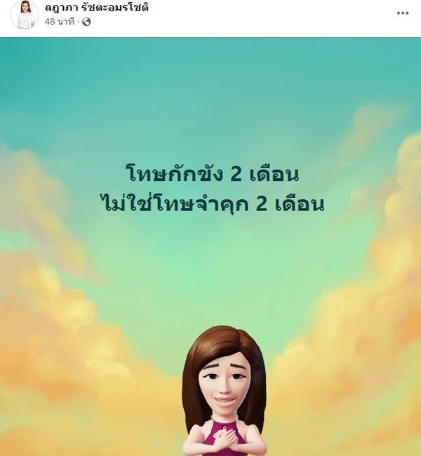 ล่าสุดนางแบบสาวเซ็กซี่ เชอรี่ สามโคก น.ส. ลฎาภา รัชตะอมรโชติ เคลื่อนไหวโพสต์เฟซบุ๊กส่วนตัว ลฎาภา รัชตะอมรโชติ เขียนข้อความระบุ “โทษกักขัง 2 เดือน ไม่ใช่โทษจำคุก 2 เดือน” โดยมีเพื่อนดารา นางแบบเข้ามาให้กำลังใจและแสดงความห่วงใย ซึ่ง เชอรี่ สามโคก ได้ตอบคอมเม้นท์อธิบายระหว่างโทษจำคุกและกักขังด้วย