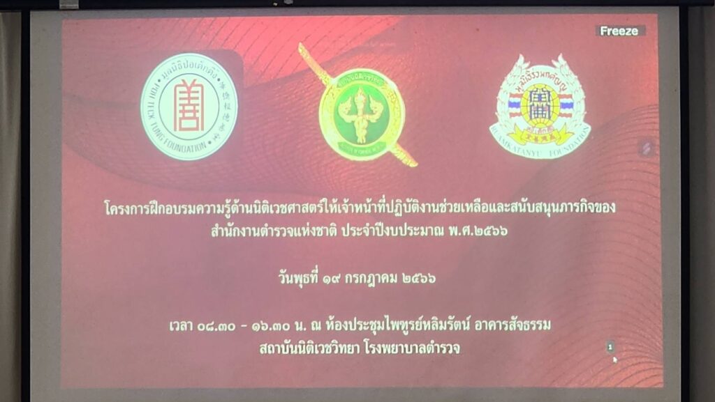วันพุธที่ 19 ก.ค.2566 กลุ่มงานพิเศษ สถาบันนิติเวชวิทยา โรงพยาบาลตำรวจ ได้จัดโครงการฝึกอบรมความรู้ด้านนิติเวชศาสตร์ให้เจ้าหน้าที่ผู้ปฏิบัติงานช่วยเหลือ และ สนับสนุนภารกิจของสำนักงานตำรวจแห่งชาติ ประจำปีงบประมาณ พ.ศ.2566 ขึ้นโดยมีวัตถุประสงค์เพื่อเพิ่มศักยภาพของเจ้าหน้าที่มูลนิธิฯ ได้เข้าใจถึงความสำคัญของวัตถุพยานในที่เกิดเหตุ การเข้าที่เกิดเหตุ และการเก็บวัตถุพยานในการเข้าตรวจ และ รักษาสถานที่เกิดเหตุ สภาพศพ