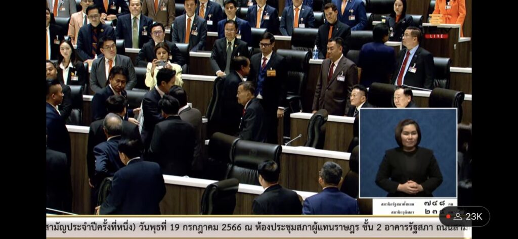 เมื่อเวลา 14.40 น. นายพิธา ลิ้มเจริญรัตน์ ยกมือขออนุญาตประธานสภา ระหว่างการอภิปราย โดยบอกว่า เมื่อมีคำสั่งศาลรัฐธรรมนูญมาถึงแล้ว ก็ขอยุติการทำหน้าที่ สส. จนกว่าจะมีคำสั่งอื่น โดยระบุว่า