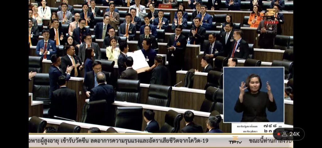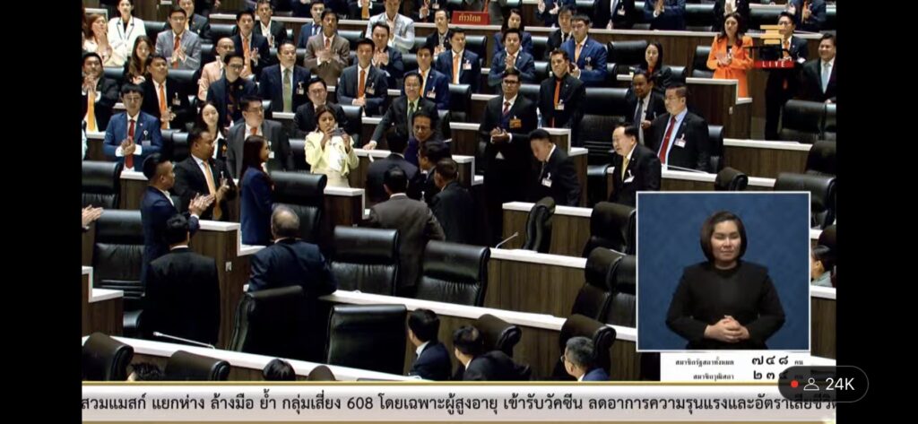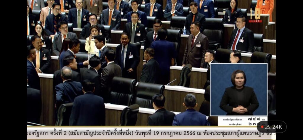 เมื่อพูดจบนายพิธาก็เดินออกจากที่ประชุม ท่ามกลางเสียงปรบมือกึกก้องทั้งที่ประชุม และประธานสภาได้กล่าวตอบว่า “ขอบคุณคุณพิธามากครับ ขอบคุณคุณพิธาที่ให้ความเคารพต่อสภา เมื่อมีคำวินิจฉัยมาถึงสภา ท่านก็ได้เคารพในกติกา นั่นก็คือไม่ขอปฏิบัติหน้าที่ในสภา จนกว่าคำวินิจฉัยจะเปลี่ยนแปลงไป”