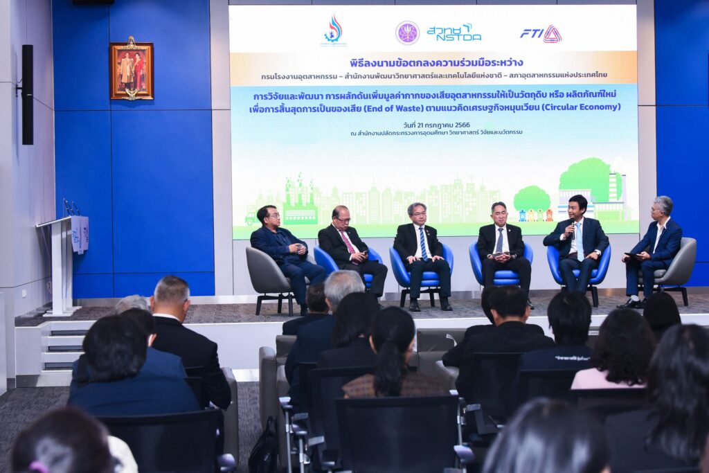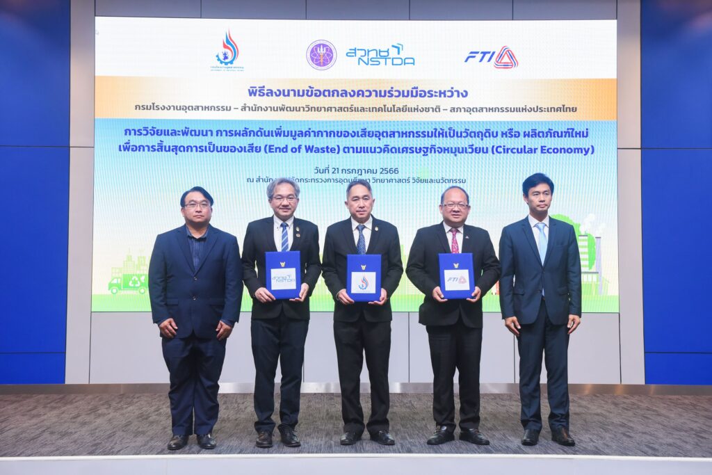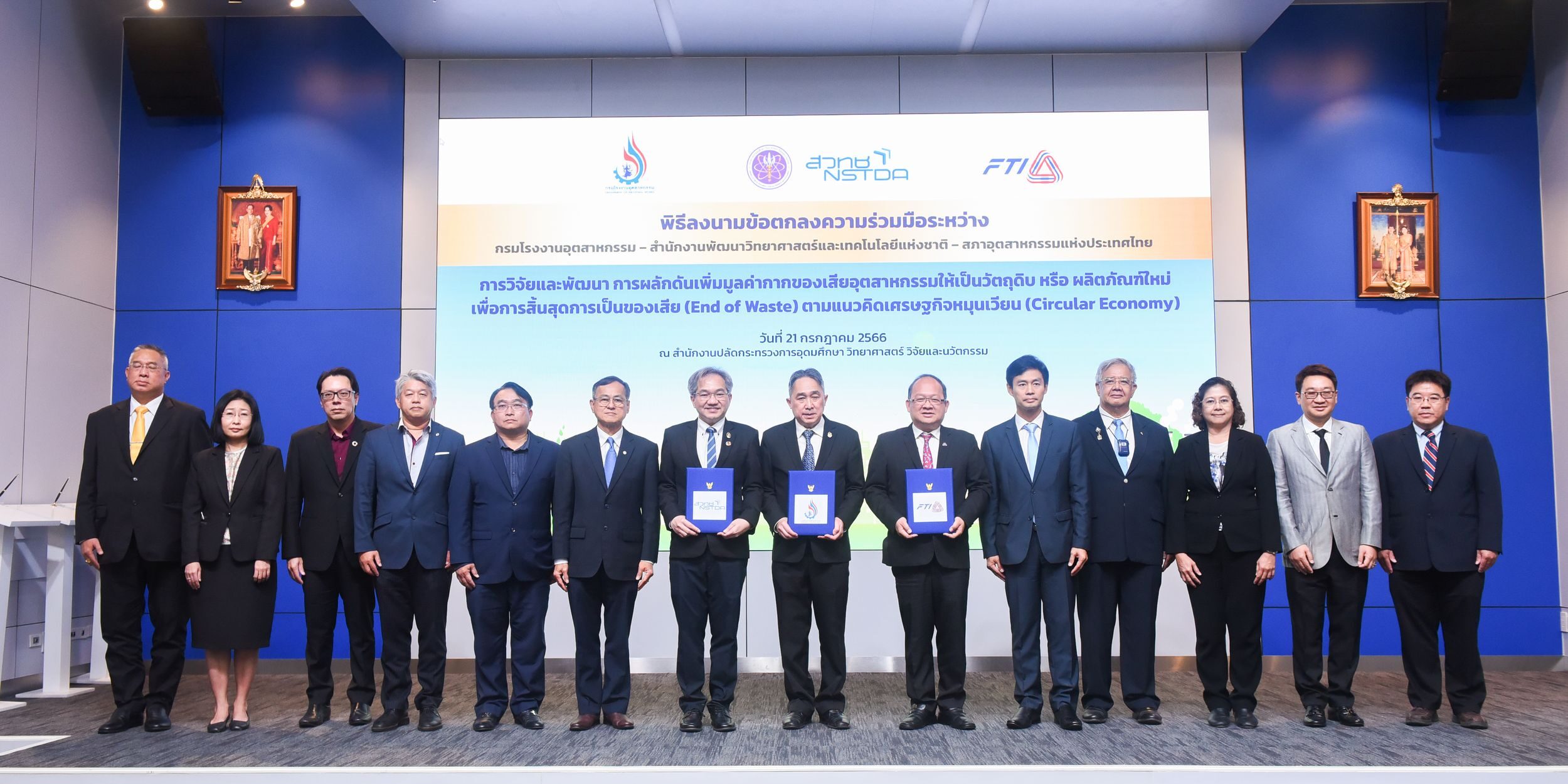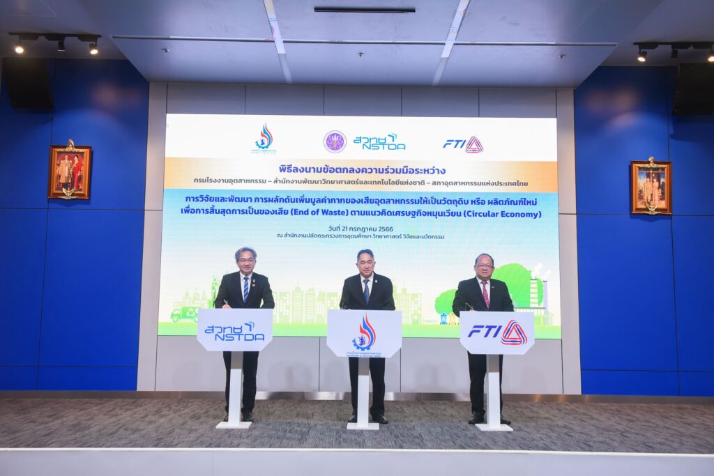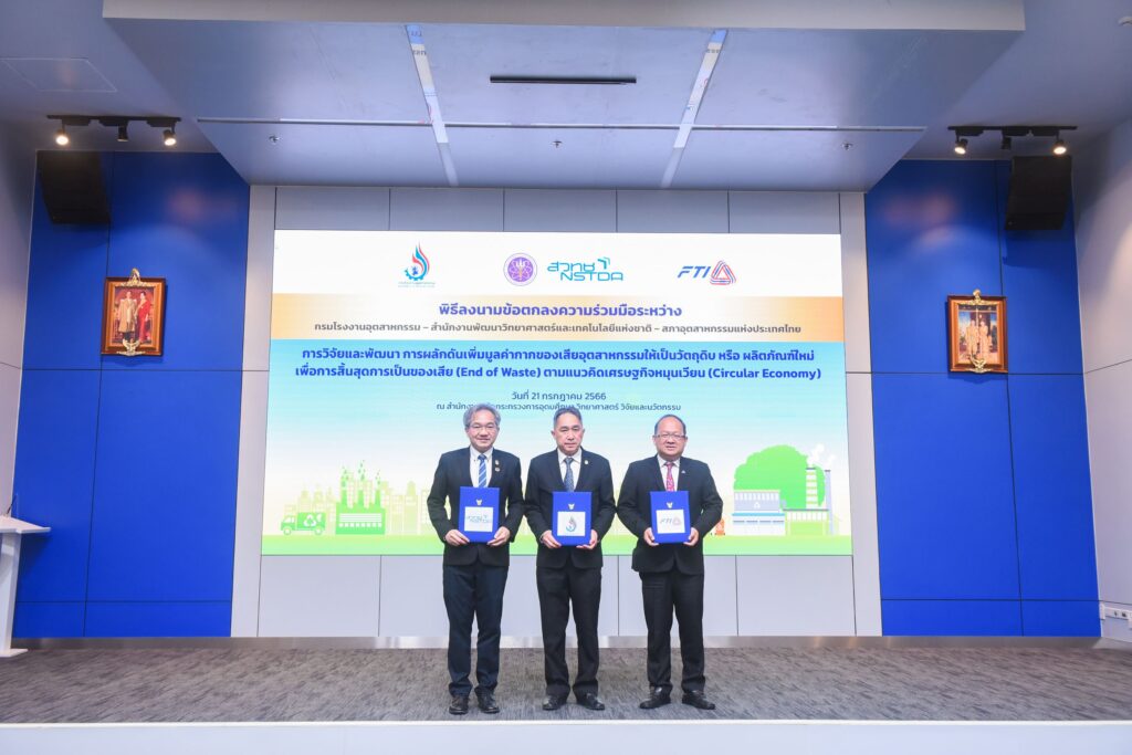 วันที่ 21 กรกฎาคม 2566 : ศาสตราจารย์ ดร.ชูกิจ ลิมปิจำนงค์ ผู้อำนวยการสำนักงานพัฒนาวิทยาศาสตร์และเทคโนโลยีแห่งชาติ (สวทช.) ดร.จุลพงษ์ ทวีศรี อธิบดีกรมโรงงานอุตสาหกรรม และนายเกรียงไกร เธียรนุกุลประธานสภาอุตสาหกรรมแห่งประเทศไทย (ส.อ.ท.) ลงนามความร่วมมือด้านการวิจัยและพัฒนาการผลักดันเพิ่มมูลค่ากากอุตสาหกรรมให้เป็นวัตถุดิบหรือผลิตภัณฑ์ใหม่ โดยมีมาตรฐานการควบคุมที่เหมาะสมทั้งในเชิงวิชาการ ความปลอดภัยต่อสิ่งแวดล้อม เพื่อการสิ้นสุดการเป็นของเสีย (End of Waste) ต่อยอดงานวิจัยสู่การใช้ประโยชน์ได้จริงและพัฒนาสู่เชิงพาณิชย์ ณ ห้องแถลงข่าว กระทรวงการอุดมศึกษา วิทยาศาสตร์ วิจัยและนวัตกรรม (อว.)