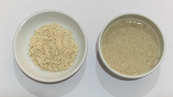 2.ซุปต้มข่าไก่กึ่งสำเร็จรูปเสริมวิตามินบี 1 บี 2 บี 12 และโฟเลต พัฒนาสูตรโดยการเลือกใช้ส่วนผสมของพืชและสมุนไพรที่มีคุณค่าทางโภชนาการสูงและมีสารต้านอนุมูลอิสระ ได้แก่ เห็ดนางรมหลวง เห็ดเข็มทอง และเห็ดฟาง นำมาผ่านกระบวนการทำแห้งแบบแช่เยือกแข็ง เพื่อให้ได้ผลิตภัณฑ์ซุปกึ่งสำเร็จรูปที่ยังคงคุณค่าทางโภชนาการไว้ได้สูงสุด นอกจากนี้ยังมีการเติมส่วนผสมของอิมัลชั่นผงที่ห่อหุ้มวิตามินบี 1 บี 2 บี 12 และโฟเลต โดยใช้เทคโนโลยีการเอนแคปซูเลชันห่อหุ้มวิตามิน และแร่ธาตุในการผลิตไกลโคสฟิงโกลิพิดไมโครอิมัลชันจากรำข้าว