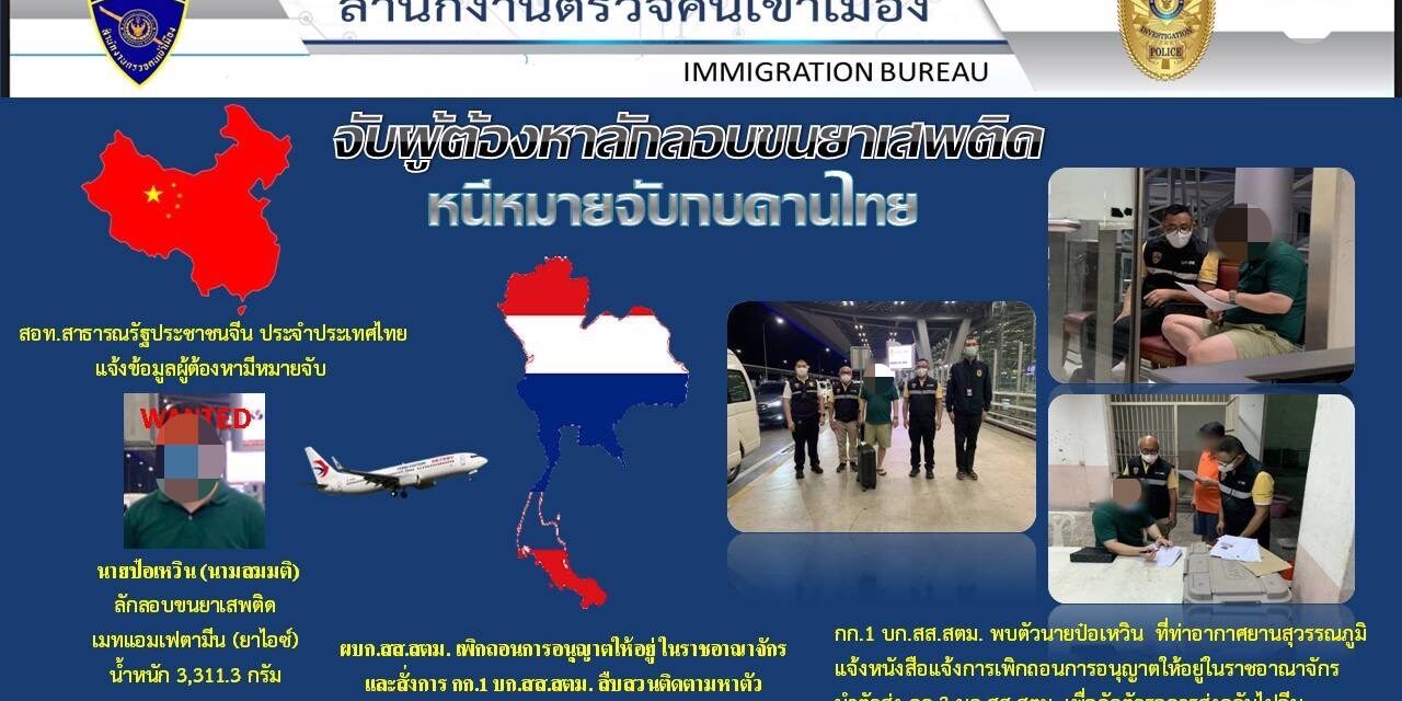 สตม. ได้รับมอบหมายจาก ตร. ให้ดำเนินการกรณี สถานเอกอัครราชทูตสาธารณรัฐประชาชนจีน ประจำประเทศไทย แจ้งข้อมูลนายป๋อเหวิน (นามสมมติ) อายุ 42 ปี สัญชาติจีน ผู้ต้องหาตามหมายจับของสาธารณรัฐประชาชนจีน ต้องหาว่ากระทำความผิดฐานลักลอบขนยาเสพติด โดยสำนักงานศุลกากรปักกิ่งได้สืบทราบว่า เมื่อวันที่ 21 ธ.ค.2563 นายป๋อเหวิน ได้ร่วมกับนางเหว่ย (นามสมมติ) หญิงชาวจีน ลักลอบนำเข้าเมทแอมเฟตามีน (ยาไอซ์) น้ำหนัก 3,311.3 กรัม โดยทางเรือ ต่อมาเมื่อวันที่ 19 ก.พ.2564 ทางการสาธารณรัฐประชาชนจีน ได้ออกหมายจับนายป๋อเหวินและนางเหว่ย แต่นายป๋อเหวิน ได้หลบหนีออกจากสาธารณรัฐประชาชนจีน