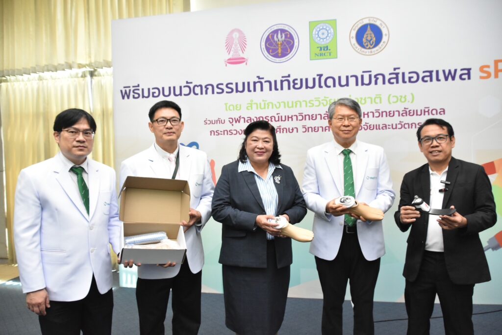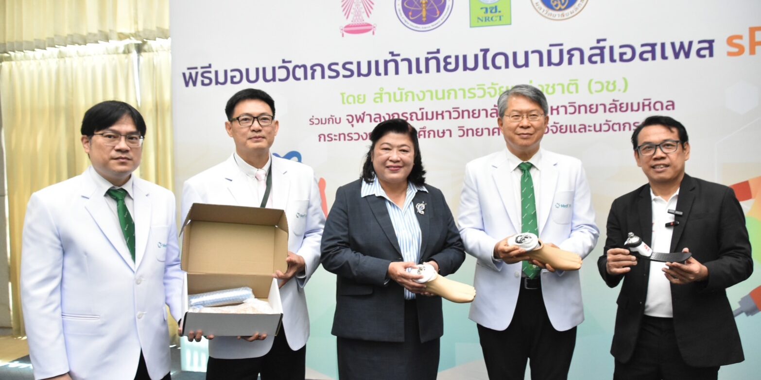 เมื่อวันที่ 22 กรกฎาคม 2566 สำนักงานการวิจัยแห่งชาติ (วช.) กระทรวงการอุดมศึกษา วิทยาศาสตร์ วิจัยและนวัตกรรม (อว.) ร่วมกับ คณะวิศวกรรมศาสตร์ จุฬาลงกรณ์มหาวิทยาลัย และมหาวิทยาลัยมหิดล จัดพิธีส่งมอบนวัตกรรมเท้าเทียมไดนามิก “sPace” คุณภาพสูง เพื่อพัฒนาคุณภาพชีวิตผู้พิการ เป็นนวัตกรรมทางการแพทย์ฝีมือนักวิจัยไทย ให้แก่ โรงพยาบาลมหาราชนครเชียงใหม่ เพื่อยกระดับคุณภาพชีวิตผู้พิการ โดยมี ดร.วิภารัตน์ ดีอ่อง ผู้อำนวยการสำนักงานการวิจัยแห่งชาติ (ผอ.วช.) พร้อมด้วย รองศาสตราจารย์ ไพรัช ตั้งพรประเสริฐ หัวหน้าโครงการวิจัยฯ ร่วมส่งมอบเท้าเทียมไดนามิก “sPace” ให้ศาสตราจารย์ นายแพทย์มานิต ศรีสุรภานนท์ รองคณบดีด้านวิจัยและนวัตกรรม คณะแพทยศาสตร์ มหาวิทยาลัยเชียงใหม่ ซึ่งมี ศาสตราจารย์ นายแพทย์ธนัฐ วานิยะพงศ์ รองผู้อำนวยการโรงพยาบาลมหาราชนครเชียงใหม่ นายธีรวัฒน์ บุญสม ผู้อำนวยการกองส่งเสริมการวิจัย (วช.) ผู้บริหารมหาวิทยาลัยเชียงใหม่และตัวแทนผู้พิการ เข้าร่วมในพิธี ณ โรงพยาบาลมหาราชนครเชียงใหม่ ถนนอินทวโรรส ตำบลศรีภูมิ อำเภอเมือง จังหวัดเชียงใหม่