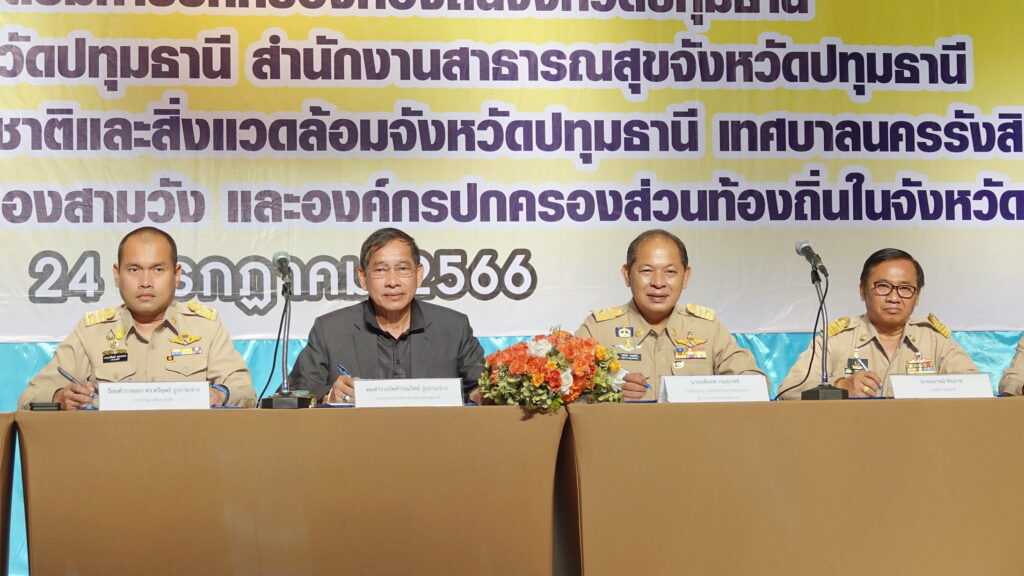 เมื่อเวลา 10.00 น. วันที่ 24 กรกฎาคม 2566 ที่อาคารหอประชุม 100 ปี เมืองธัญญบูรี เทศบาลนครรังสิต อำเภอธัญบุรี จังหวัดปทุมธานี นายอดิเทพ กมลเวชช์ รองผู้ว่าราชการจังหวัด รักษาราชการแทน ผู้ว่าราชการจังหวัดปทุมธานี เป็นประธานในพิธีลงนาม บันทึกข้อตกลง (MOU) การทำความตกลงร่วมมือกันจัดทำบริการสาธารณะในการดำเนินการศูนย์พักพิงสุนัขและแมวจรจัดจังหวัดปทุมธานี เพื่อแก้ปัญหาการระบาดของโรคพิษสุนัขบ้า การสงเคราะห์และจัดการสวัสดิภาพสัตว์ของจังหวัดปทุมธานี ระหว่าง จังหวัดปทุมธานี องค์การบริหารส่วนจังหวัดปทุมธานี สำนักงานส่งเสริมการปกครองท้องถิ่นจังหวัดปทุมธานี สำนักงานปศุสัตว์จังหวัดปทุมธานี สำนักงานสาธารณสุขจังหวัดปทุมธานี สำนักงานทรัพยากรธรรมชาติและสิ่งแวดล้อมจังหวัดปทุมธานี เทศบาลนครรังสิต อำเภอหนองเสือ เทศบาลตำบลหนองสามวัง และองค์กรปกครองส่วนท้องถิ่นในจังหวัดปทุมธานี