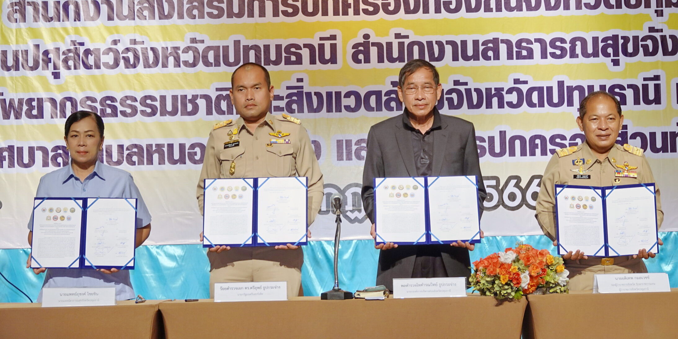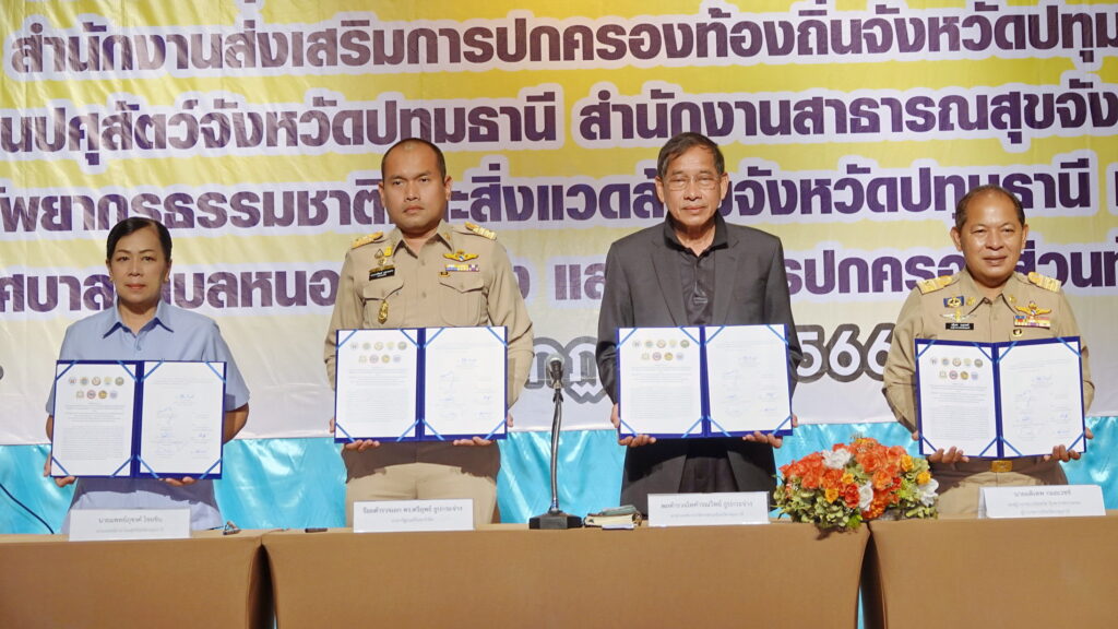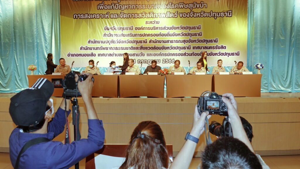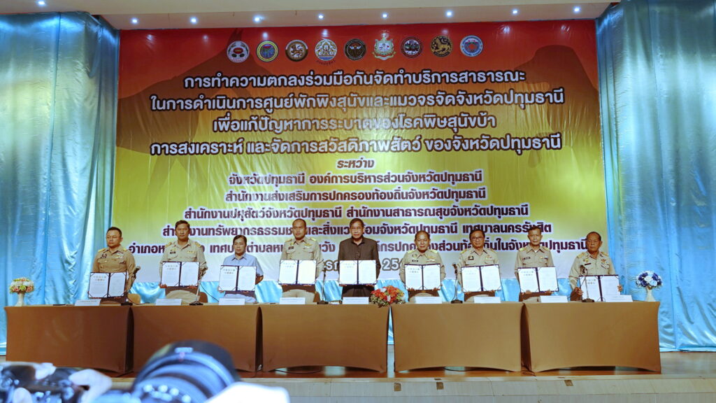 ในพิธีลงนามประกอบด้วย นายอดิเทพ กมลเวชช์ รองผู้ว่าราชการจังหวัด รักษาราชการแทน ผู้ว่าราชการจังหวัดปทุมธานี , พลตำรวจโทคำรณวิทย์ ธูปกระจ่าง นายกองค์การบริหารส่วนจังหวัดปทุมธานี , นายณกรณ์ ทินราช ปศุสัตว์จังหวัดปทุมธานี , นายมนัส สุวรรณรินทร์ ท้องถิ่นจังหวัดปทุมธานี , ร้อยตำรวจเอก ดร.ตรีลุพธ์ ธูปกระจ่าง นายกเทศมนตรีนครรังสิต , นายสุชาติ คงสำเร็จ ผู้อำนวยการสำนักงานทรัพยากรธรรมชาติและสิ่งแวดล้อมจังหวัดปทุมธานี , ว่าที่ร้อยตรี ธีระพล โชคนำชัย นายอำเภอหนองเสือ , นายหยวก ประยงค์ นายกเทศมนตรีตำบลหนองสามวัง และ ผู้แทนนายแพทย์ภุชงค์ ไชยชิน นายแพทย์สาธารณสุขจังหวัดปทุมธานี ร่วมลงนามร่วมมือกันจัดทำบริการสาธารณะในการดำเนินการศูนย์พักพิงสุนัขและแมวจรจัดจังหวัดปทุมธานี สำหรับโรคพิษสุนัขบ้า (Rabies) หรือโรคกลัวน้ำ (Hydrophobia) คือ โรคติดต่อจากสัตว์สู่คนที่มีอันตรายร้ายแรง โดยผู้ป่วยที่สัมผัสกับสัตว์ติดเชื้อ จะได้รับเชื้อไวรัสโรคพิษสุนัขบ้าผ่านทางน้ำลายของสัตว์ที่กัด ทำให้เกิดอาการทางระบบประสาท เช่น ซัก ประสาทหลอน อัมพาต โดยโรคพิษสุนัขบ้าเป็นโรคร้ายแรงถึงชีวิต เนื่องจากปัจจุบันยังไม่มียารักษาโรค ซึ่งตามพระปณิธานศาสตราจารย์ ดร.สมเด็จเจ้าฟ้าฯ กรมพระศรีสวางควัฒน วรชัตติยราชนาวี ทรงพระประสงค์ที่จะให้โรคพิษสุนัขบ้าหมดไปจากประเทศไทย