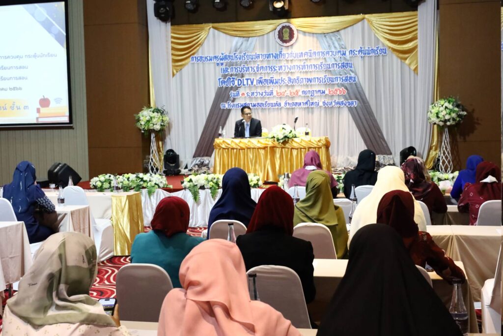วันที่ 24 กรกฎาคม 2566) เวลา 09.00 น. : ดร.ประพัทธ์ รัตนอรุณ รองเลขาธิการคณะกรรมการส่งเสริมการศึกษาเอกชน (รองเลขาธิการ กช.) เป็นประธานเปิดการอบรมครูผู้สอนโรงเรียนปลายทางเกี่ยวกับเทคนิคการควบคุม กระตุ้นนักเรียน และการบริหารจัดการระหว่างการทำการเรียนการสอน โดยใช้ DLTV เพื่อเพิ่มประสิทธิภาพการเรียนการสอน โดยมี นายวิรัช ลิ้มเจริญสุข ผู้อำนวยการกลุ่มงานโรงเรียนนโยบายพิเศษ ดร.สุกรี แวมูซอ ผู้อำนวยการสำนักงานการศึกษาเอกชนจังหวัดสงขลา คณะทำงานโครงการฯ บุคลากร สช.จังหวัดนราธิวาสและจังหวัดยะลา และครูโรงเรียนเอกชนที่ได้รับการสนับสนุนสื่อ และอุปกรณ์สำหรับการจัดการศึกษาทางไกลผ่านดาวเทียม (DLTV) ในพื้นที่จังหวัดนราธิวาสและจังหวัดยะลาเข้าร่วมพิธีเปิด ณ โรงแรมสยามออเรียนทัล อำเภอหาดใหญ่ จังหวัดสงขลา