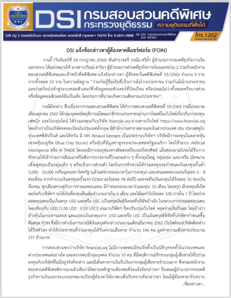กรณีดังกล่าว สืบเนื่องจากกรมสอบสวนคดีพิเศษ ได้ทำการสอบสวนคดีพิเศษที่ 55/2563 กรณีประมาณเดือนตุลาคม 2560 ได้กลุ่มบุคคลมีพฤติการณ์โฆษณาชักชวนประชาชนผ่านการโพสต์ในเว็บไซต์เกี่ยวกับการลงทุน เฟซบุ๊ก และในกลุ่มไลน์ ให้ร่วมลงทุนกับบริษัท financial.org ผ่านทางเว็บไซต์ https://www.financial.org โดยอ้างว่าเป็นบริษัทจดทะเบียนในประเทศอังกฤษ มีสำนักงานสาขาหลายแห่งในต่างประเทศ เช่น ประเทศดูไบ ประเทศฟิลิปปินส์ และไต้หวัน มี MR. Arnaud Georges เป็นประธานบริษัทฯ บริษัทมีการลงทุนในตลาดหุ้น เทรดหุ้นบลูชิพ (Blue Chip Stocks) หรือหุ้นที่มีมูลค่าสูงของประเทศสหรัฐอเมริกา โดยใช้ระบบ Artificial Intelligence หรือ AI TRADE โดยจะมีการระบุช่องทางติดต่อหรือเบอร์โทรศัพท์ เมื่อสอบถามไปจะได้รับการชักชวนให้เข้าร่วมการสัมมนาหรือฟังการบรรยายที่โรงแรมต่างๆ ทั้งกลุ่มใหญ่ กลุ่มย่อย และ/หรือ นัดหมายเพื่อพูดคุยเป็นกลุ่มเล็กๆ หรือเป็นการส่วนตัว โดยในการชักชวนให้ร่วมลงทุนจะกำหนดเงินลงทุนขั้นต่ำ 3,000 – 10,000 เหรียญดอลลาร์สหรัฐ (แล้วแต่ช่วงระยะเวลาในการลงทุน) และเสนอผลตอบแทนร้อยละ 6 – 8 ต่อเดือน จากจำนวนเงินลงทุนครั้งแรก (ประมาณร้อยละ 96 ต่อปี) และจะคืนเงินลงทุนให้ร้อยละ 16 ของเงินที่ลงทุน ทุกเดือนควบคู่กับการจ่ายผลตอบแทน มีกำหนดระยะเวลาร่วมลงทุน 12 เดือน โดยสรุป นักลงทุนที่เปิดพอร์ตกับบริษัทฯ จะได้เงินที่ลงทุนคืนเต็มจำนวนภายใน 6 เดือน และได้ผลกำไรร้อยละ 100 ภายใน 1 ปี โดยจ่ายผลตอบแทนเป็นเงินสกุล USD และหรือ USC (เป็นสกุลเงินดิจิตอลที่บริษัทอ้างอิง ในระบบการจ่ายผลตอบแทนโดยเทียบกับ USD (1.00 USD : 0.10 USC)) ต่อมาบริษัทฯ ปิดปรับปรุงเว็บไซต์ หยุดจ่ายเงินปันผล โดยอ้างว่าล้างหุ้นในกระดานเทรด และแปลงเงินลงทุนจาก USD และหรือ USC เป็นเงินสกุลดิจิทัลที่บริษัทฯกำหนดขึ้น คือสกุล FOIN ซึ่งมีการดำเนินการภายใต้เงินสกุลดังกล่าวประมาณเดือนธันวาคม 2562 เว็บไซต์ของบริษัทดังกล่าวได้ปิดตัวลง ทำให้ประชาชนที่ร่วมลงทุนได้รับความเสียหาย จำนวน 146 คน มูลค่าความเสียหายประมาณ 137 ล้านบาท ซึ่งในการสอบสวนพบว่าบริษัท financial.org ไม่มีการจดทะเบียนจัดตั้งเป็นนิติบุคคลทั้งในประเทศและต่างประเทศแต่อย่างใด และตรวจพบมีกลุ่มบุคคล จำนวน 10 คน ที่มีพฤติการณ์ชักชวนกลุ่มผู้เสียหายให้ไปร่วมลงทุนกับบริษัทที่ไม่มีอยู่จริงดังกล่าว และมีเส้นทางการเงินรับเงินจากกลุ่มผู้เสียหายจำนวนมาก ซึ่งคณะพนักงานสอบสวนคดีพิเศษพิจารณาแล้วเห็นว่ามีพยานหลักฐานเพียงพอที่จะแจ้งข้อกล่าวหา จึงเสนอผู้อำนวยการกองคดีธุรกิจการเงินนอกระบบออกหมายเรียกผู้ต้องหาให้มาพบเพื่อรับทราบข้อกล่าวห