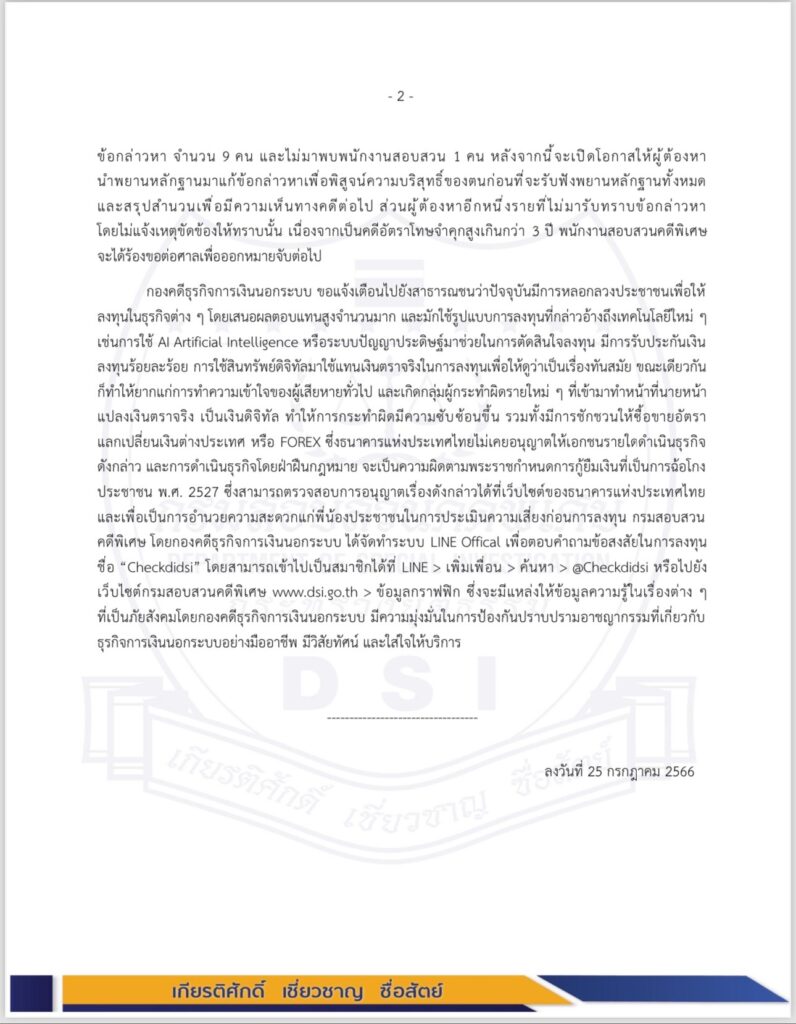 กองคดีธุรกิจการเงินนอกระบบ ขอแจ้งเตือนไปยังสาธารณชนว่าปัจจุบันมีการหลอกลวงประชาชนเพื่อให้ลงทุนในธุรกิจต่างๆ โดยเสนอผลตอบแทนสูงจำนวนมาก และมักใช้รูปแบบการลงทุนที่กล่าวอ้างถึงเทคโนโลยีใหม่ๆ เช่นการใช้ AI Artificial Intelligence หรือระบบปัญญาประดิษฐ์มาช่วยในการตัดสินใจลงทุน มีการรับประกันเงินลงทุนร้อยละร้อย การใช้สินทรัพย์ดิจิทัลมาใช้แทนเงินตราจริงในการลงทุนเพื่อให้ดูว่าเป็นเรื่องทันสมัย ขณะเดียวกันก็ทำให้ยากแก่การทำความเข้าใจของผู้เสียหายทั่วไป และเกิดกลุ่มผู้กระทำผิดรายใหม่ๆ ที่เข้ามาทำหน้าที่นายหน้าแปลงเงินตราจริง เป็นเงินดิจิทัล ทำให้การกระทำผิดมีความซับซ้อนขึ้น รวมทั้งมีการชักชวนให้ซื้อขายอัตราแลกเปลี่ยนเงินต่างประเทศ หรือ FOREX ซึ่งธนาคารแห่งประเทศไทยไม่เคยอนุญาตให้เอกชนรายใดดำเนินธุรกิจดังกล่าว และการดำเนินธุรกิจโดยฝ่าฝืนกฎหมาย จะเป็นความผิดตามพระราชกำหนดการกู้ยืมเงินที่เป็นการฉ้อโกงประชาชน พ.ศ.2527 ซึ่งสามารถตรวจสอบการอนุญาตเรื่องดังกล่าวได้ที่เว็บไซต์ของธนาคารแห่งประเทศไทย และเพื่อเป็นการอำนวยความสะดวกแก่พี่น้องประชาชนในการประเมินความเสี่ยงก่อนการลงทุน กรมสอบสวนคดีพิเศษ โดยกองคดีธุรกิจการเงินนอกระบบ ได้จัดทำระบบ LINE Offical เพื่อตอบคำถามข้อสงสัยในการลงทุน ชื่อ “Checkdidsi” โดยสามารถเข้าไปเป็นสมาชิกได้ที่ LINE > เพิ่มเพื่อน > ค้นหา > @Checkdidsi หรือไปยังเว็บไซต์กรมสอบสวนคดีพิเศษ www.dsi.go.th > ข้อมูลกราฟฟิก ซึ่งจะมีแหล่งให้ข้อมูลความรู้ในเรื่องต่างๆ ที่เป็นภัยสังคมโดยกองคดีธุรกิจการเงินนอกระบบ มีความมุ่งมั่นในการป้องกันปราบปรามอาชญากรรมที่เกี่ยวกับธุรกิจการเงินนอกระบบอย่างมืออาชีพ มีวิสัยทัศน์ และใส่ใจให้บริการ