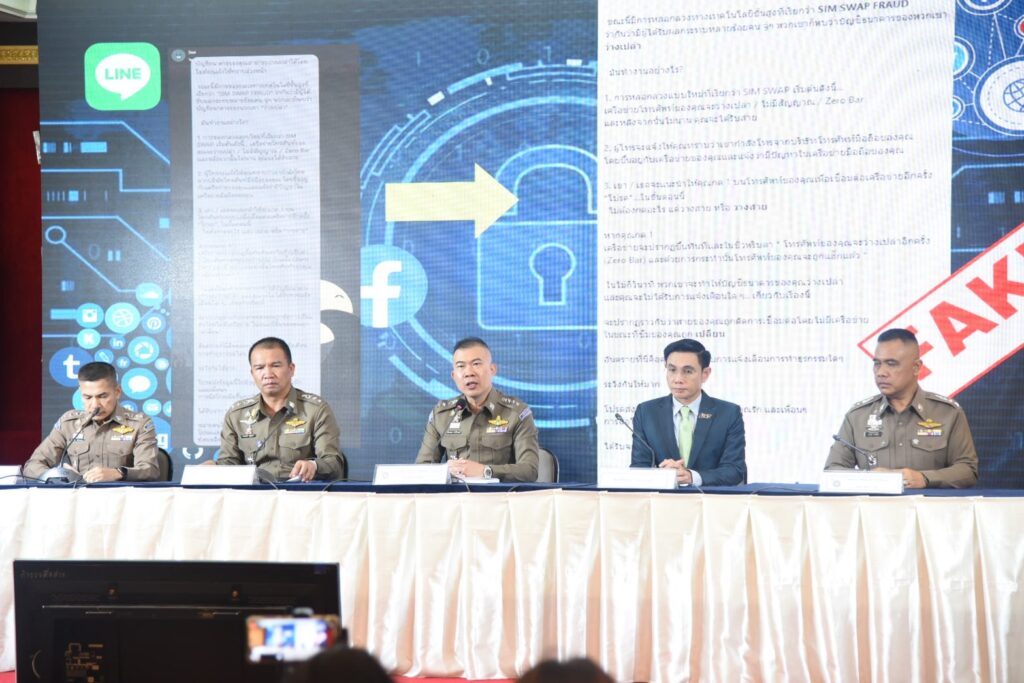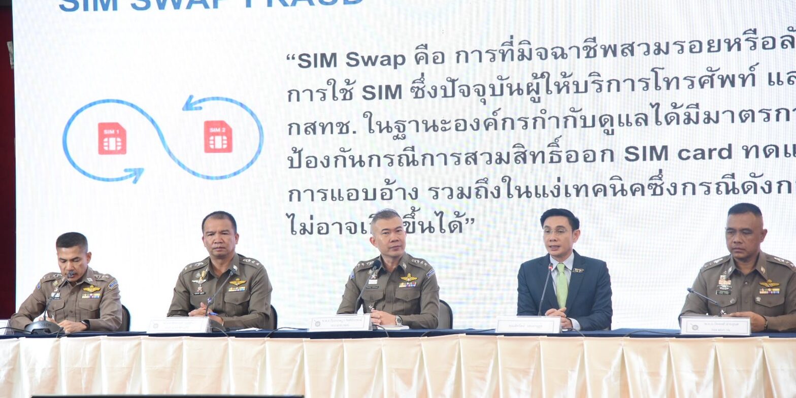 สำนักงานตำรวจแห่งชาติ โดย พล.ต.อ.ดำรงศักดิ์ กิตติประภัสร์ ผบ.ตร.,พล.ต.อ.รอย อิงคไพโรจน์ รอง ผบ.ตร.,พล.ต.อ.สมพงษ์ ชิงดวง ที่ปรึกษาพิเศษ ตร./หัวหน้าคณะทำงานสร้างเสริมภูมิคุ้มกันต้านภัยอาชญากรรมทางเทคโนโลยี และ พล.ต.ท.ธัชชัย ปิตะนีละบุตร ผู้ช่วย ผบ.ตร. มีความห่วงใยพี่น้องประชาชนกรณีมีการแชร์ในโลกโซเชียลเกี่ยวกับการสวมซิม (SIM SWAP) เพื่อควบคุมเครื่องโทรศัพท์และโอนเงินออกจากบัญชีไป จึงได้ร่วมกับสมาคมโทรคมนาคมแห่งประเทศไทย ในพระบรมราชูปถัมภ์ แถลงข่าว เมื่อวันที่ 26 ก.ค.2566 เวลา 10.30 น. ณ สำนักงานตำรวจแห่งชาติ