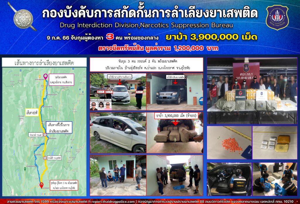รายแรก จากการขยายผลของตำรวจ บก.สกส. ในจับกุมเครือข่ายยาเสพติดพื้นที่ จ.ลพบุรี พบว่ายังมีกลุ่มผู้ร่วมขบวนการลักลอบลำเลียงยาเสพติดเป็นชาติพันธุ์ (เผ่าม้ง) ซึ่งมีพฤติการณ์การรับจ้างลำเลียงยาเสพติด ให้กับกลุ่มผู้ค้ายาเสพติด ทราบชื่อว่านายจำรัส กับพวก โดยจะลำเลียงยาเสพติดจากพื้นที่ทาง จ.เชียงราย นำไปส่งมอบให้กับลูกค้าทางพื้นที่ภาคกลาง จึงวางแผนจับกุม จนกระทั่งวันที่ 9 ก.ค.2566 เวลาประมาณ 12.30 น. พบรถยนต์ยี่ห้อ FORD RANGER สีฟ้า ทะเบียน บพ 94XX พะเยา ใช้ในการซุกซ่อนและลำเลียงยาเสพติด โดยมีนายจำรัส เป็นผู้ขับขี่ และ รถยนต์ ยี่ห้อ HONDA MOBILIO สีขาว ทะเบียน 4 กพ 574 กทม. ใช้ในการคุ้มกัน/สำรวจด่าน โดยมี น.ส.ณกัญญาชนาภัทร และนางสุภาพ เป็นผู้ขับขี่ ตำรวจ ปส.ได้ติดตามรถทั้ง 2 คัน และสามารถจับกุมได้ที่บริเวณรีสอร์ทแห่งหนึ่ง ม.6 ต.ป่าแฝก อ.กงไกรลาศ จ.สุโขทัย จากการตรวจค้นพบ ยาบ้า จำนวนประมาณ 3.9 ล้านเม็ด ได้ที่รถคันที่นายจำรัส ขับขี่ โดย น.ส.ณกัญชนาภัทร และนางสุภาพ รับว่าเป็นผู้ขับขี่รถนำสำรวจเส้นทาง จากนั้นจึงนำตัวผู้ต้องหา พร้อมของกลาง ส่งพนักงานสอบสวนดำเนินคดีตามกฎหมาย และขยายผลออกหมายจับผู้บุคคลในเครือข่ายและยึดทรัพย์สินตามประมวลกฎหมายยาเสพติด พ.ศ.2564 ต่อไป