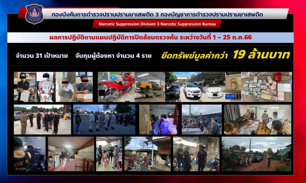 นอกจากนี้ ในห้วงเดือน ก.ค.2566 ตำรวจ ปส. ได้เปิดปฏิบัติการปิดล้อมตรวจค้น รวม 67 จุด ทั่วประเทศ ได้แก่ จ.พระนครศรีอยุธยา สมุทรปราการ ปทุมธานี ชลบุรี อุดรธานี ชลบุรี นครพนม เชียงใหม่ ตาก นครสวรรค์ สงขลา ฯลฯ โดย บก.ปส. 3 ปิดล้อมตรวจค้น 31 เป้าหมาย จับกุมผู้ต้องหาเครือข่ายยาเสพติด 4 ราย ยึดอายัดทรัพย์สินไว้ตรวจสอบ เช่น รถยนต์ ที่ดินและสิ่งปลูกสร้าง มูลค่ากว่า 19 ล้านบาท และ บก.ปส.2 ได้เปิดปฏิบัติการปิดล้อมตรวจค้น 36 จุด สามารถจับกุมผู้ต้องหาได้ 3 ราย ยึดอายัดทรัพย์สินไว้ตรวจสอบ ได้แก่ รถยนต์ 7 คัน จยย. 2 คัน ที่ดินพร้อมสิ่งปลูกสร้าง 5 แปลง ที่ดินพร้อมสวนยางพารา 1 แปลง โฉนดที่ดิน 9 ฉบับ บัญชีธนาคารยอดเงิน 1.1 ล้านบาท และทรัพย์สินอื่น ๆ รวมมูลค่ากว่า 116 ล้านบาท