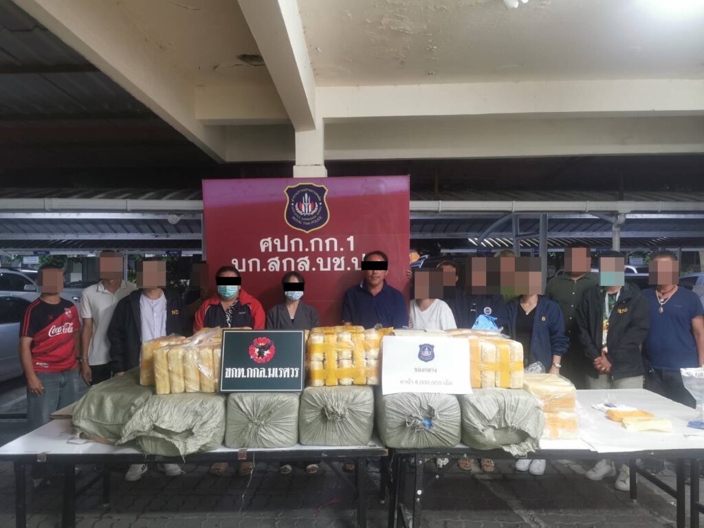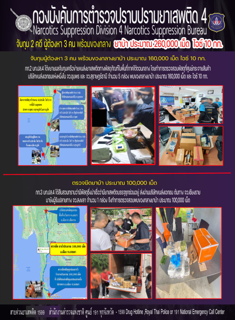 รายที่ 4 ตำรวจ ปส.4 (นปส.ภูเก็ต) ได้สืบสวนขยายผลจากการตรวจยึดยาเสพติด ที่ส่งทางไปรษณีย์พัสดุภัณฑ์ ในภาคใต้ จนทราบว่านายเนติกร และ น.ส.พรนำภา มีพฤติการณ์ลักลอบขนส่งยาเสพติดผ่านทางไปรษณีย์พัสดุภัณฑ์ โดยใช้รถยนต์ ทะเบียน กอ 1XXX ภูเก็ต เป็นพาหนะ จึงได้ติดตามเฝ้าระวังบุคคลและรถยนต์คันดังกล่าว จนกระทั่งทราบว่า นายเนติกร และ น.ส.พรนำภา ได้ขับรถยนต์ ทะเบียน กอ 1XXX ภูเก็ต จะไปรับยาเสพติดที่ จ.สมุทรสาคร จึงประสานให้ตำรวจ ปส.4 ประจำด่านยานพาหนะชุมพร สกัดจับรถคันดังกล่าว ต่อมาวันที่ 7 ก.ค.2566 ตำรวจ ปส.4 ประจำด่านยานพาหนะชุมพร สามารถสกัดจับกุมรถคันดังกล่าวได้ จากการตรวจค้น พบยาบ้าประมาณ 200 เม็ด และไอซ์ประมาณ 38 กรัม และพบสลิปการส่งพัสดุ จากการสอบถามนายเนติกร และ น.ส.พรนำภา รับว่าไปรับยาเสพติดที่ จ.สมุทรสาคร โดยพัสดุได้ถูกส่งให้กับลูกค้าพื้นที่จ.ระนอง,จ.สุราษฎร์ธานี,จ.พังงา และ จ.ภูเก็ต ตำรวจ ปส.4 จึงขยายผลไปตรวจยึดพัสดุที่ศูนย์กระจายสินค้า บริษัท Flash Express จ.ชุมพร และ จ.สุราษฎร์ธานี จำนวน 5 กล่อง ของกลางยาบ้า ประมาณ 160,000 เม็ด และ ไอซ์ 10 กก. จึงจับกุมตัวผู้ต้องหาพร้อมของกลางส่ง พงส.ปส.4 เพื่อดำเนินการขยายผลถึงผู้ร่วมขบวนการต่อไป