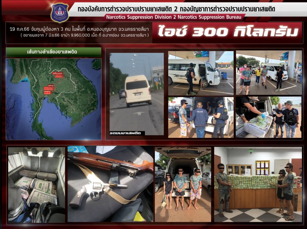 รายที่ 3 สืบเนื่องจาก ตำรวจ ปส.2 ร่วมกับ บก.ขส. ได้จับกุมเครือข่ายยาเสพติด ในพื้นที่ จ.นครราชสีมา จากนั้นได้สืบสวนขยายผลจนทราบว่านายตะวันหรือเปียว กับพวก มีพฤติการณ์ลักลอบลำเลียงยาเสพติดจากแนวชายแดนภาคอีสานเข้าสู่พื้นที่ตอนใน โดยใช้รถตู้ยี่ห้อโตโยต้า รุ่นคอมมิวเตอร์ สีขาว ทะเบียน ฮง-77XX กทม. เป็นยานพาหนะในการลำเลียงยาเสพติดในครั้งนี้ จึงได้ร่วมกันวางแผนการจับกุม วางกำลังตามเส้นทางที่คาดว่ากลุ่มนายตะวัน จะใช้เป็นเส้นทางในการลำเลียงยาเสพติดในครั้งนี้ จนกระทั่งวันที่ 18 ก.ค.2566 เวลากลางคืน ต่อเนื่องวันที่ 19 ก.ค.2566 พบรถคันเป้าหมายในเขตพื้นที่ จ.มหาสารคาม ขับมุ่งหน้ามุ่งหน้าไป จ.บุรีรัมย์ จนเข้าเขต จ.นครราชสีมา จึงได้สกัดจับกุมได้ที่บริเวณสถานีน้ำมันในพื้นที่ ต.หนองหัวแรต อ.หนองบุญมาก จ.นครราชสีมา โดยมีนายตะวันหรือเปียว (เป็นผู้ขับขี่) นางสาวพัณณิตา หรือแป้ง (นั่งคู่คนขับ) และมีนายมาโนช หรือดิว (นอนอยู่ด้านหลัง) พร้อมของกลางเป็นยาเสพติด ไอซ์ 300 กก. บรรจุในกระสอบ จำนวน 8 กระสอบ ซุกซ่อนอยู่ในรถยนต์ และอาวุธปืนไรเฟิล 1 กระบอก และปืนสั้น 1 กระบอก จากนั้นจึงจับกุมตัวผู้ต้องหาพร้อมของกลาง นำส่ง พงส.ปส.2 เพื่อดำเนินคดีตามกฎหมายต่อไป