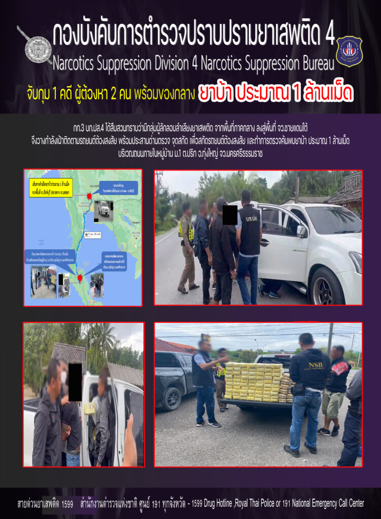 รายที่ 5 ตำรวจ ปส.4 ได้ทำการสืบสวนพบว่า มีกลุ่มผู้ลักลอบลำเลียงยาเสพติดจากพื้นที่ภาคใต้ได้เดินทางไปรับยาเสพติดจากพื้นที่ภาคกลางและจะนำส่งผู้รับในพื้นที่จังหวัดภาคใต้โดยใช้รถยนต์ ทะเบียน 3ขบ 4xxx กทม. เป็นพาหนะ และได้ทำการเปลี่ยนทะเบียนรถคันเดียวกัน เป็น กท 8xxx ประจวบคีรีขันธ์ ต่อมาพบรถยนต์คันหมายเลขทะเบียน กท 8xxx ประจวบคีรีขันธ์ บริเวณทางหลวงสาย 41 อ.ถ้ำพรรณรา จ.นครศรีธรรมราช จึงตั้งจุดสกัดบริเวณแยกหนองดี ต.ทุ่งสง อ.นาบอน จ.นครศรีธรรมราช จนกระทั่งวันที่ 15 ก.ค.2566 รถยนต์เป้าหมาย ยังไม่เข้าจุดสกัด จากการสืบสวนติดตาม ทราบว่า รถคันดังกล่าวได้เปลี่ยนป้ายทะเบียน เป็นทะเบียน 3ขบ 4xxx กทม. และขับหลบหนีมุ่งหน้า อ.ทุ่งใหญ่ จ.นครศรีธรรมราช ตำรวจ ปส.4 จึงติดตามไปจนถึงพื้นที่ ต.ปริก อ.ทุ่งใหญ่ จ.นครศรีธรรมราช และพบรถคันดังกล่าว จึงเรียกให้หยุดรถเพื่อทำการตรวจค้น จากการตรวจค้นพบยาบ้า 1,000,000 เม็ด ซุกซ่อนอยู่บริเวณเบาะหลัง ทราบชื่อนายจนุมาศ เป็นผู้ขับขี่ และ น.ส.เบญจวรรณ นั่งข้างคนขับ จากการสอบถาม ผู้ต้องหาทั้งสองรับว่าได้รับยาเสพติดมาจาก จ.สิงห์บุรี เพื่อนำส่งผู้รับที่ จ.สงขลา จึงควบคุมตัวผู้ต้องหาพร้อมของกลางนำส่ง พงส.ปส.4 ดำเนินคดีและขยายผลถึงผู้ร่วมขบวนการต่อไป