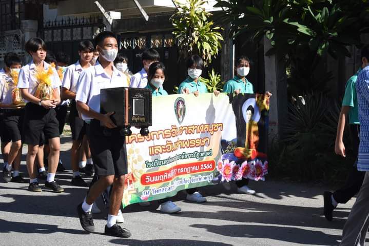 วันที่ 27 กรกฎาคม 2566 อาจารย์ ดร.บุณยานุช เฉวียงหงส์ ผู้อำนวยการโรงเรียนสาธิตมหาวิทยาลัยราชภัฏเทพสตรี ให้เกียรติเป็นประธานนำคณะผู้บริหาร ครู และบุคลากรโรงเรียนสาธิตมหาวิทยาลัยราชภัฏเทพสตรี ร่วมทำบุญถวายเทียนพรรษาเนื่องในวันอาสาฬหบูชาและวันเข้าพรรษา ประจำปี 2566 แด่พระภิกษุสงฆ์ที่จำพรรษา โดยมีวัตถุประสงค์เพื่อให้นักเรียนมีส่วนร่วมในการทำนุบำรุงศาสนา และได้รับความรู้ พิธีการ ขั้นตอนในการถวายเทียนพรรษาแด่พระภิกษุสงฆ์ ณ วัดคลองสายบัว อำเภอเมือง จังหวัดลพบุรี