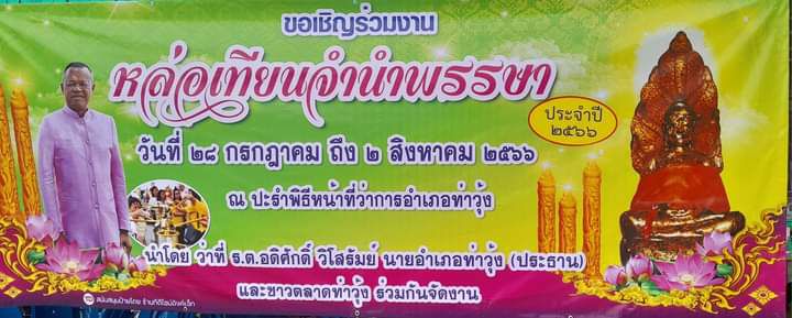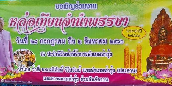 วิโสรัมย์ นายอำเภอท่าวุ้ง ชวนเชิญพุทธศาสนิกชน/บุคคลทั่วไป.ร่วมหล่อเทียนจำนำพรรษา เพื่อถวายทุกวัดภายในเขตพื้นที่อำเภอท่าวุ้ง ประจำปีนี้ โดยตั้งประรำพิธีบริเวณสนามหน้าที่ว่าการอำเภอท่าวุ้ง เพื่อให้ประชาชนทั่วไปได้ร่วมพิธีประเพณีเทเทียน เพื่อหล่อเป็นแท่งเทียนขนาดใหญ ซึ่งเป็นประเพณีของชาวอำเภอท่าวุ้ง ที่ปฏิบัติสืบทอดต่อกันมาหลายสิบปีมาแล้ว