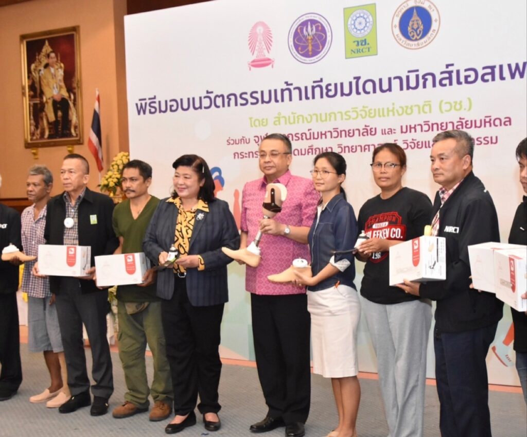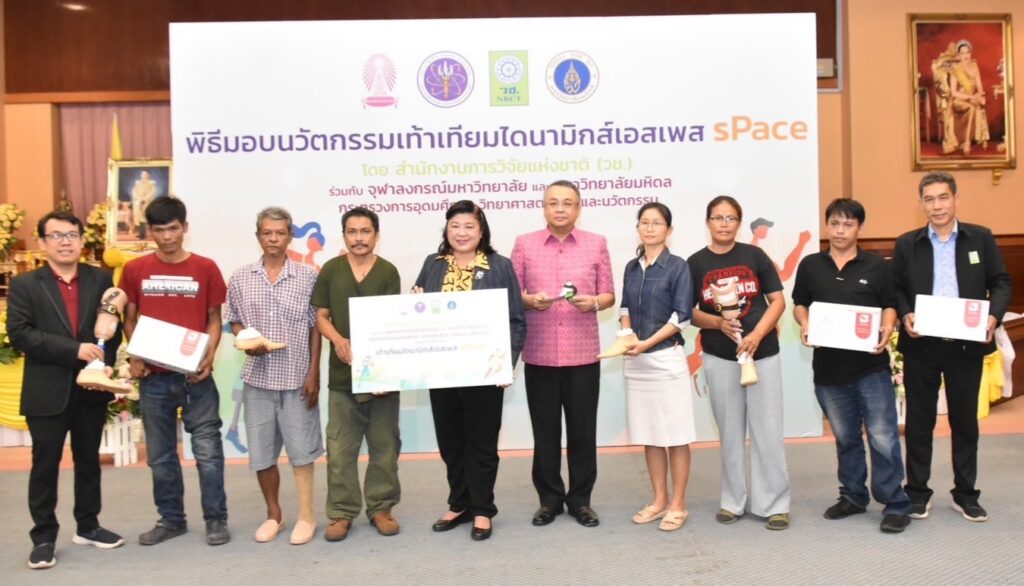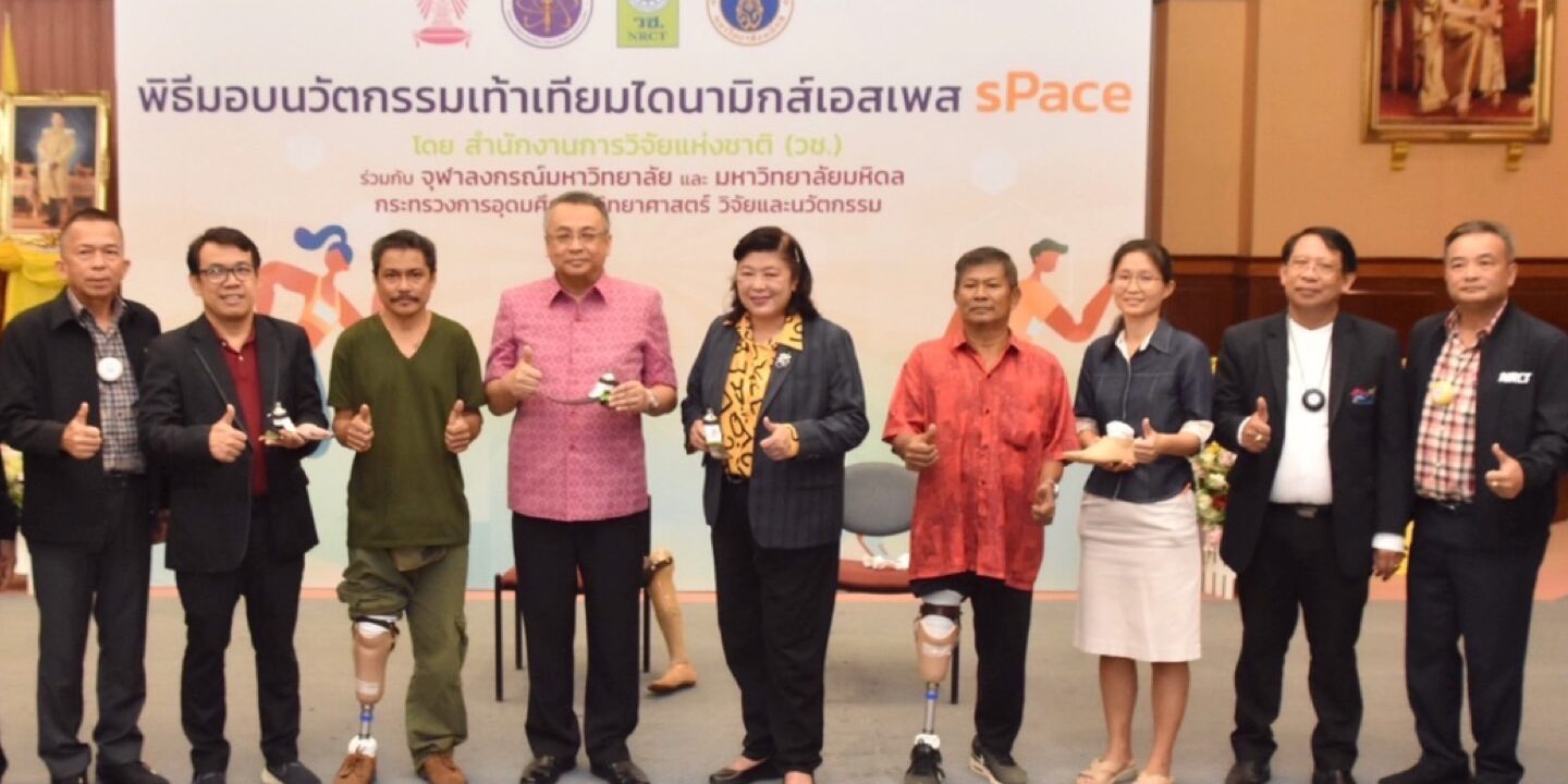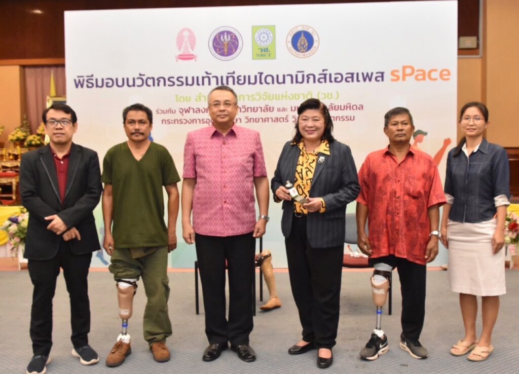 เมื่อวันอาทิตย์ที่ 30 กรกฎาคม 2566 สำนักงานการวิจัยแห่งชาติ (วช.) กระทรวงการอุดมศึกษา วิทยาศาสตร์ วิจัยและนวัตกรรม (อว.) ร่วมกับ คณะวิศวกรรมศาสตร์ จุฬาลงกรณ์มหาวิทยาลัย และมหาวิทยาลัยมหิดล จัดพิธีส่งมอบนวัตกรรมเท้าเทียมไดนามิก sPace คุณภาพสูง เพื่อพัฒนาคุณภาพชีวิตผู้พิการ เป็นนวัตกรรมทางการแพทย์ฝีมือนักวิจัยไทย ให้แก่ โรงพยาบาลสุราษฎร์ธานี เพื่อยกระดับคุณภาพชีวิตผู้พิการ โดยมี ดร.วิภารัตน์ ดีอ่อง ผู้อำนวยการสำนักงานการวิจัยแห่งชาติ (ผอ.วช.) เป็นประธาน และมี นายวิชวุทย์ จินโต ผู้ว่าราชการจังหวัดสุราษฎร์ธานี ให้การต้อนรับ โดย รองศาสตราจารย์ ไพรัช ตั้งพรประเสริฐ หัวหน้าโครงการวิจัยฯ ร่วมส่งมอบเท้าเทียมไดนามิก “sPace” ให้กับ แพทย์หญิงสิณีนาฎ เจนวณิชสถาพร หัวหน้ากลุ่มงานเวชกรรมฟื้นฟู โรงพยาบาลสุราษฎร์ธานี ซึ่งมีผู้บริหารโรงพยาบาลสุราษฎร์ธานีและตัวแทนผู้พิการ เข้าร่วมในพิธี ณ โรงพยาบาลสุราษฎร์ธานี จังหวัดสุราษฎร์ธานี