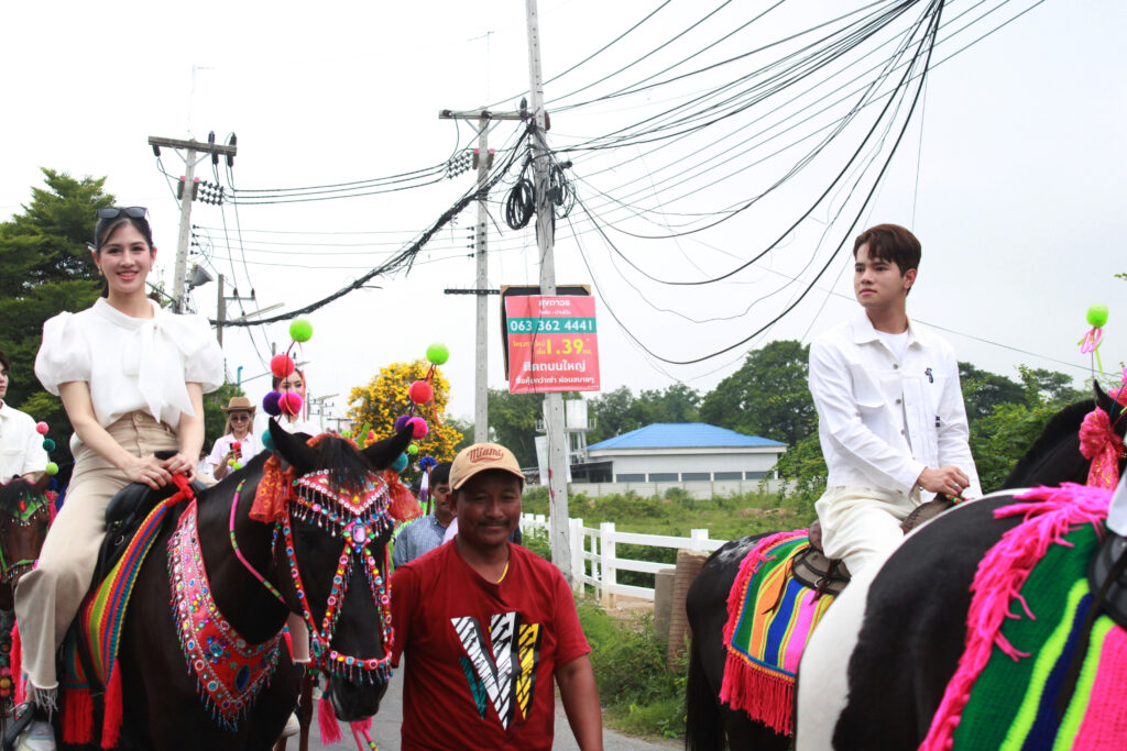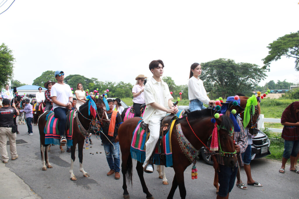 บรรยากาศในช่วงเช้าได้มีการจัดขบวน ม้า ควาย วัวเทียมเกวียน ที่ถูกตกแต่งอย่างสวยงามตระการตา โดยมีกลุ่มชาวบ้านแต่งตัวเป็นเจ้าเงาะเดินนำขบวน อีกหนึ่งสีสันภายในงานนี้คือเหล่าศิลปินนักแสดงที่ได้ขึ้นนั่งบนหลังม้า และร่วมขบวนแห่ไปตามถนนสายหลัก เลียบแม่น้ำแม่กลอง มุ่งหน้าเข้าสู่ตัวเมืองอำเภอบ้านโป่ง แม้สายฝนจะเทกระหน่ำลงมา แต่บรรยากาศก็เป็นไปอย่างอบอุ่น โดยมีประชาชนให้ความสนใจออกมายืนรอชมกันริมสองข้างทาง นอกจากนี้ทีมนักแสดงยังได้แวะเวียนไปทักทายเหล่าพ่อค้าแม่ขายผู้ใจบุญ ในตลาดเก่าโคยกี๊ ตลาดริมนํ้าแม่น้ำแม่กลอง ที่ต่างออกมาร่วมทำบุญกับเหล่านักแสดงกันอย่างคึกคัก
