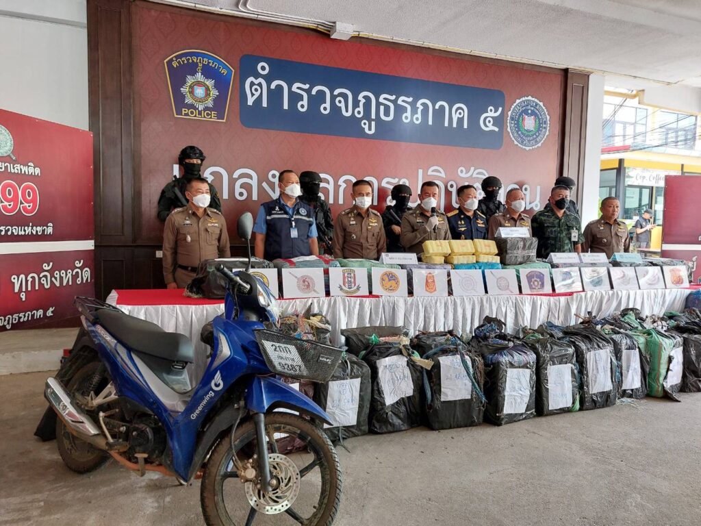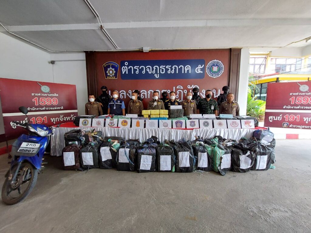 วันที่ 3 สิงหาคม 2566 เวลา 09.30 น. ตำรวจภูธรภาค 5 โดย พล.ต.ท.ปิยะ ต๊ะวิชัย ผบช.ภ.5 ,พล.ต.ต.พฤทธิพงษ์ ประยูรศิริ รอง ผบช.ภ.5 ,พล.ต.ต.วีรชน บุญทวี รอง ผบช.ภ.5, นายอภิกิต ฉ โรจน์ประเสริฐ ผอ.ป.ป.ส.ภาค 5 ,พ.อ.ยอดชาย พวงวรินทร์ รอง เสธ.ศอ.ปส.ชน., พ.ต.อ.พิทักษ์ นาสมวาส รอง ผบก.สส.ภ.5, พ.ต.อ.พงษ์สวัสดิ์ ไชยบาล รอง ผบก.ภ.จว.เชียงราย , พ.ต.อ.ถนัด ชุ่มมะโน ผกก.สภ.เชียงแสน จว.เชียงราย ได้ร่วมกันแถลงผลการปฏิบัติของชุดปราบปรามยาเสพติดตำรวจภูธรจังหวัดเชียงราย สามารถจับกุมขบวนการลำเลียงยาเสพติดรายสำคัญ โดยจับกุมผู้ต้องหาได้จำนวน 1 คน ยึดยาบ้าของกลางจำนวน 7 ล้านเม็ด,รถยนต์จำนวน 1 คัน และรถจักรยานยนต์จำนวน 1 คัน ได้ที่บริเวณถนนเชียงแสน-เชียงของ หน้าด่านกักกันสัตว์ อ.เชียงแสน จว.เชียงราย เมื่อวันที่ 26 ก.ค.66 เวลาประมาณ 01.00 น.