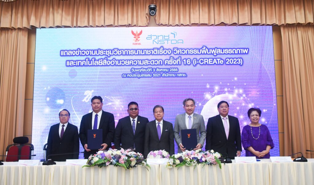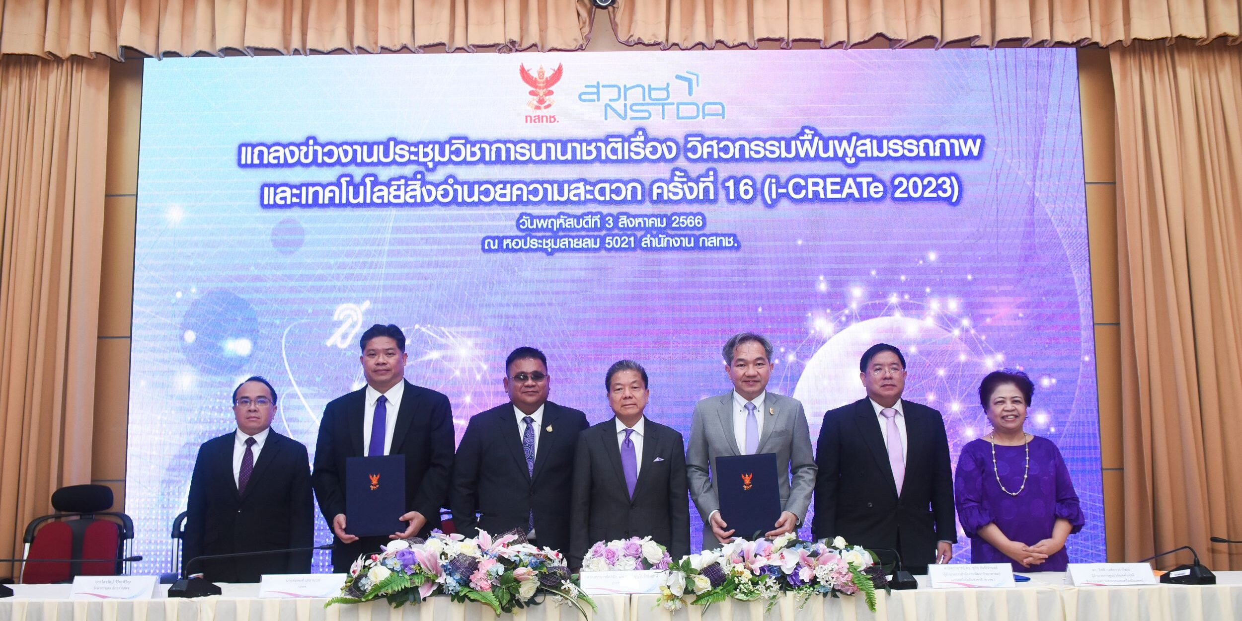 วันที่ 3 สิงหาคม 2566 : สำนักงานคณะกรรมการกิจการกระจายเสียง กิจการโทรทัศน์ และกิจการโทรคมนาคมแห่งชาติ (กสทช.) ร่วมกับสำนักงานพัฒนาวิทยาศาสตร์และเทคโนโลยีแห่งชาติ (สวทช.) ลงนามในบันทึกข้อตกลงความร่วมมือการส่งเสริมการเรียนรู้เพื่อสร้างนวัตกรรมด้านกิจการกระจายเสียง กิจการโทรทัศน์ และกิจการโทรคมนาคมที่ออกแบบสำหรับทุกคน (Inclusive Design) และเทคโนโลยีสิ่งอำนวยความสะดวก (Assistive Technology) พร้อมทั้งแถลงข่าวร่วมจัดงานประชุมวิชาการนานาชาติ เรื่องวิศวกรรมพื้นฟูสมรรถภาพและเทคโนโลยีสิ่งอำนวยความสะดวก ครั้งที่ 16 (i-CREATe 2023) โดยมี ศาสตราจารย์คลินิก นพ.สรณ บุญใบชัยพฤกษ์ ประธาน กสทช. ศาสตราจารย์ ดร.ชูกิจ ลิมปิจำนงค์ ผู้อำนวยการ สวทช. นายต่อพงศ์ เสลานนท์ กรรมการ กสทช. ด้านการส่งเสริมสิทธิเสรีภาพของประชาชน และผู้บริหารคณะนักวิจัยทั้งสองหน่วยงานร่วมแถลงข่าว ณ หอประชุมสายลม 5021 (หอประชุม ชั้น 2) สำนักงาน กสทช.