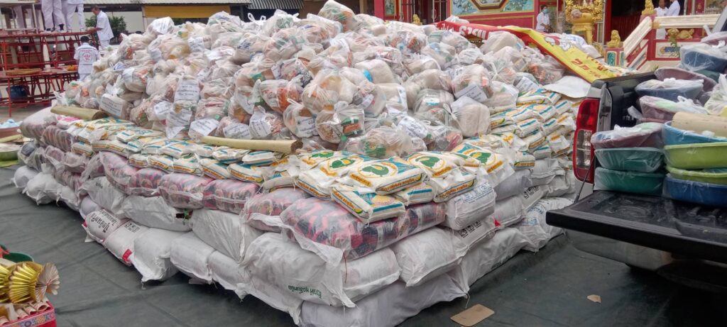 งานประเพณีทิ้งกระจาด เป็นงานประจำปีที่ได้จัดต่อกันมาเป็นเวลา ๔๐ ปีแล้ว ได้งดจัดไป 5 ปีด้วยสถานการณ์ โควิด วัตถุประสงค์ของการจัดงานเพื่อเป็นการ อุทิศส่วนกุศลให้บรรพบุรุษและเจ้ากรรมนายเวร เพื่อให้วิญญาณเหล่านั้นได้ไปสู่ สุคติ และเป็นการเสริมมงคลให้กับผู้ร่วมงานทุกท่าน ในปีนี้เริ่มจัดงานตั้งแต่วันที่ ๓๑ กรกฎาคม ถึง ๒ สิงหาคม ๒๕๖๖ ซึ่งในวันนี้เป็นพิธีเสริมมงคลแก่ทุกท่านและ ครอบครัว ด้วยการแจกสิ่งของแก่ผู้ยากไร้และผู้ด้อยโอกาสจำนวน ๑๖๐๐ครอบครัว โดยมี