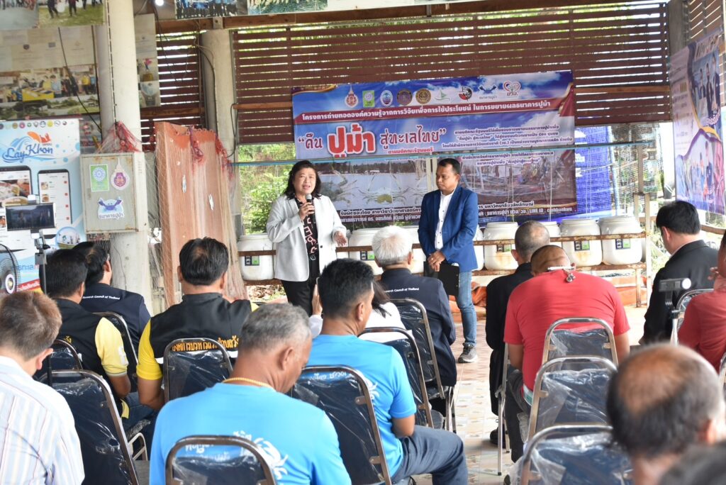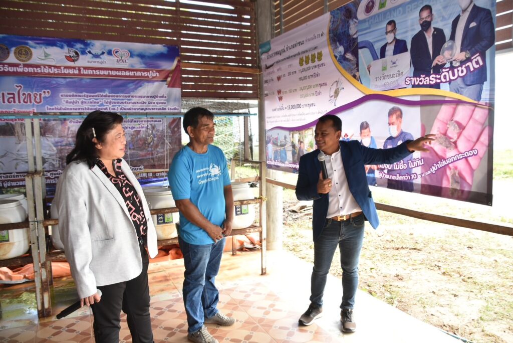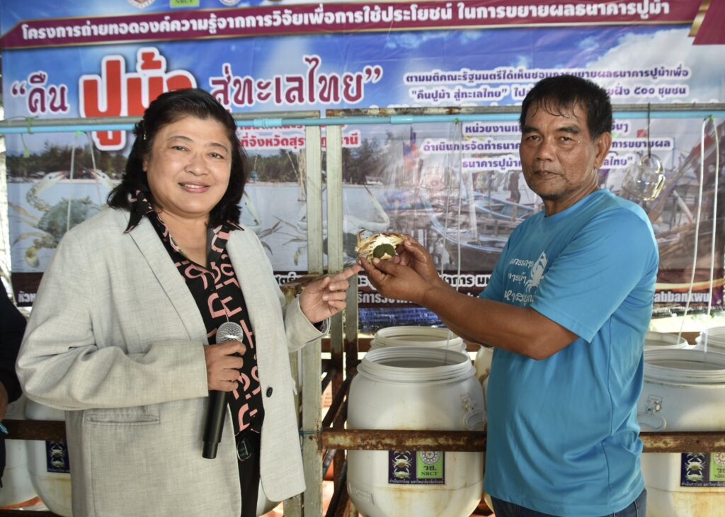 เมื่อวันที่ 31 กรกฎาคม 2566 สำนักงานการวิจัยแห่งชาติ (วช.) กระทรวงการอุดมศึกษา วิทยาศาสตร์ วิจัยและนวัตกรรม (อว.) โดย ดร.วิภารัตน์ ดีอ่อง ผู้อำนวยการสำนักงานการวิจัยแห่งชาติ (ผอ.วช.) พร้อมด้วย คณะผู้ทรงคุณวุฒิจาก (วช.) ลงพื้นที่จังหวัดสุราษฎร์ธานี เพื่อเยี่ยมชมผลสำเร็จของการดำเนินงาน โครงการวิจัย เรื่อง “การประยุกต์ใช้ธนาคารปูม้าเพื่อบริหารจัดการทรัพยากรชายฝั่งและยกระดับรายได้ให้กับชาวประมงในพื้นที่จังหวัดนครศรีธรรมราชและสุราษฎร์ธานี” ที่ (วช.) ให้การสนับสนุนทุนวิจัย โดย ผู้ช่วยศาสตราจารย์ ดร.อมรศักดิ์ สวัสดี จาก มหาวิทยาลัยวลัยลักษณ์ หัวหน้าโครงการวิจัยฯ พร้อมด้วย นายคนอง อินทรัตน์ รองนายกองค์การบริหารส่วนตำบลวัง