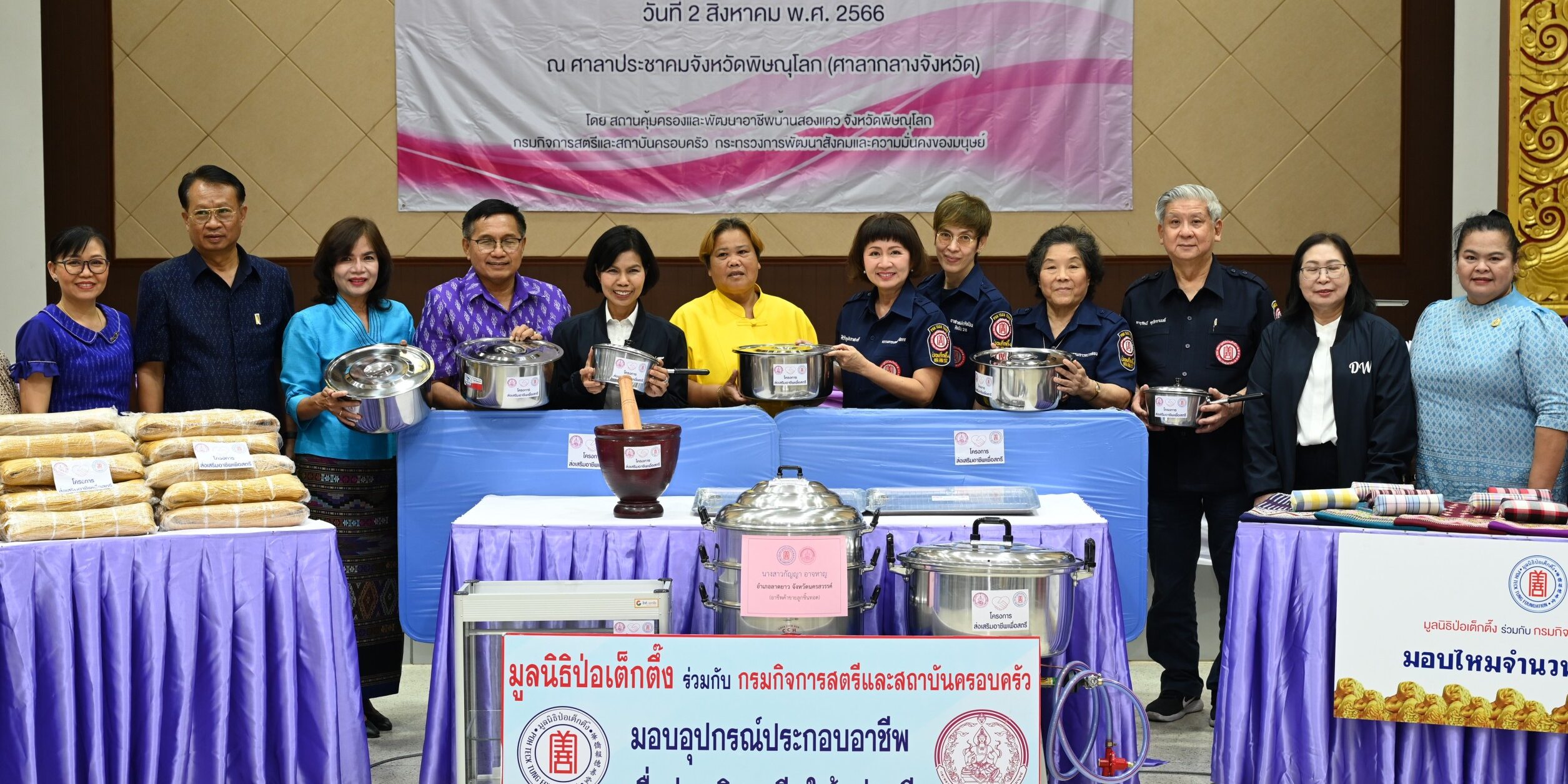 วานนี้ (วันที่ 2 สิงหาคม 2566) มูลนิธิป่อเต็กตึ๊ง โดย นางศิริกุล โอภาสวงศ์ กรรมการและเลขาธิการ พร้อมด้วย นายจารุรัตน์ คุณัตถานนท์ กรรมการและเหรัญญิก นางจินดา บุญลาภทวีโชค กรรมการตรวจสอบ และนางสาวดวงชุตา ติยะพจนพรกุล ผู้ช่วยผู้จัดการฝ่ายสังคมสงเคราะห์ นำทีมลงพื้นที่จังหวัดพิษณุโลก มอบวัสดุอุปกรณ์ประกอบอาชีพให้กับสตรีที่มีรายได้น้อย มีภาระหน้าที่ดูแลคนในครอบครัว เป็นแม่เลี้ยงเดี่ยว หรือด้อยโอกาสทางสังคม ซึ่งอยู่ในความดูแลของสถานคุ้มครองและพัฒนาอาชีพบ้านสองแคว จังหวัดพิษณุโลก จำนวน 21 ราย พร้อมมอบรถเข็นวีลแชร์แก่คนพิการ จำนวน 10 ราย รวมงบประมาณเป็นเงินทั้งสิ้น 348,650 บาท (สามแสนสี่หมื่นแปดพันหกร้อยห้าสิบบาทถ้วน) เพื่อให้สามารถประกอบอาชีพเลี้ยงตนเองและครอบครัวได้อย่างยั่งยืน โดยมี นางจินตนา จันทร์บำรุง อธิบดีกรมกิจการสตรีและสถาบันครอบครัว นายวาทิต ปัญญาคม รองผู้ว่าราชการจังหวัดพิษณุโลก พร้อมด้วย นางสาวศุภรัตน์ สมบัติเจริญไทย หัวหน้าแผนกส่งเสริมการศึกษาและอาชีพ มูลนิธิป่อเต็กตึ๊ง และอาสาสมัครศิลปิน นำโดย นางสาวอัญชลี จงคดีกิจ (ปุ๊-อัญชลี) ร่วมแจกจ่ายในครั้งนี้ ณ ศาลาประชาคมจังหวัดพิษณุโลก (ศาลากลางจังหวัด) ตำบลในเมือง อำเภอเมือง จังหวัดพิษณุโลก