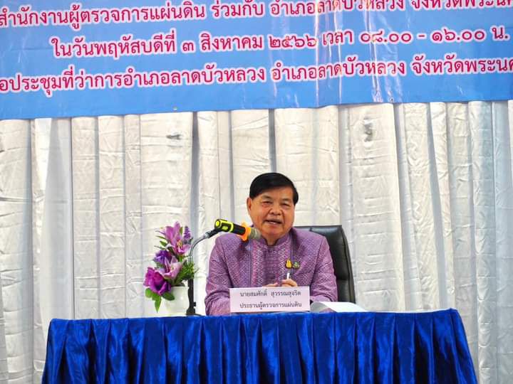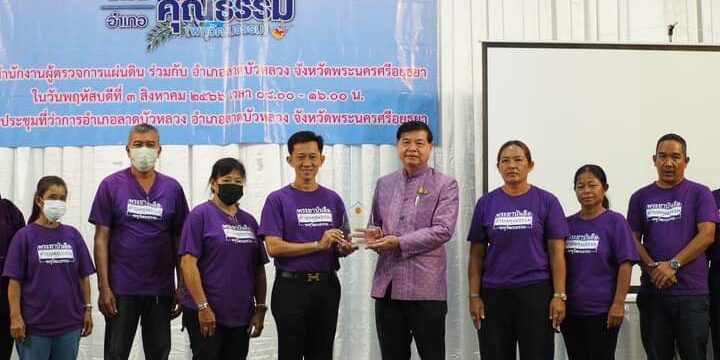 วันพฤหัสบดี ที่ 3 สิงหาคม 2566 เวลา 09.30 น. ณ หอประชุมที่ว่าการอำเภอลาดบัวหลวง อำเภอลาดบัวหลวง จังหวัดพระนครศรีอยุธยk นายสมศักดิ์ สุวรรณสุจริต ประธานผู้ตรวจการแผ่นดิน ร่วมกับจังหวัดพระนครศรีอยุธยา โดยนายนิวัฒน์ รุ่งสาคร ผู้ว่าราชการจังหวัดพระนครศรีอยุธยา มอบหมายให้ นายกกชัย ฉายรัศมีกุล รองผู้ว่าราชการจังหวัดพระนครศรีอยุธยา กล่าวเปิดกิจกรรมโครงการส่งเสริมธรรมาภิบาลเพื่อต่อต้านการทุจริต กิจกรรมลาดบัวหลวงอำเภอคุณธรรม (จังหวัดพระนครศรีอยุธยา) ประจำปีงบประมาณ พ.ศ.2566 โดยมีนายอดิเรก อุ่นโอสถ นายอำเภอลาดบัวหลวง กำนัน ผู้ใหญ่บ้าน ประชาชนในพื้นที่ ผู้บริหาร/ตัวแทนองค์กรบริหารส่วนท้องถิ่น ผู้บริหาร/ตัวแทนจากโรงพยาบาลและรพ.สต. ครูอาจารย์จากโรงเรียนทุกแห่งใน 7 ตำบลในอำเภอลาดบัวหลวง หัวหน้าส่วนราชการระดับจังหวัด เจ้าหน้าที่จากสำนักงาน ป.ป.ช. และสำนักงานผู้ตรวจการแผ่นดิน รวมกว่า 400 คน ร่วมกิจกรรมการประกาศเจตนารมณ์ “อำเภอลาดบัวหลวงอำเภอคุณธรรม”ภายใต้การดำเนินโครงการส่งเสริมธรรมาภิบาลเพื่อต่อต้านการทุจริต กิจกรรมลาดบัวหลวงอำเภอคุณธรรม (จังหวัดพระนครศรีอยุธยา) ของสำนักงานผู้ตรวจการแผ่นดิน ซึ่งมีกิจกรรมการบรรยายความสำคัญของโครงการ “ตำบลคุณธรรม” สู่ “อำเภอคุณธรรม” กับการดำเนินงานตามหน้าที่และอำนาจของผู้ตรวจการแผ่นดิน โดยนายสมศักดิ์ สุวรรณสุจริต ประธานผู้ตรวจการแผ่นดิน และพิธีมอบโล่การเข้าร่วมขับเคลื่อนโครงการฯ เครือข่ายอำเภอคุณธรรมของสำนักงานผู้ตรวจการแผ่นดิน ในการร่วมขับเคลื่อน “ตำบล/อำเภอคุณธรรม” ให้กับตัวแทนตำบลและอำเภอ และยังมีกิจกรรมการเสวนาแลกเปลี่ยนเรียนรู้ “การบริหารจัดการขยะชุมชน” ซึ่งเป็นปัญหาหลักที่ประชาชนได้สะท้อนออกมาจากกระบวนการดำเนินโครงการตำบลคุณธรรม ซึ่งเป็นประเด็นความเดือดร้อนของประชาชนในพื้นที่ที่อยากแก้ไขร่วมกัน โดยเน้นการมีส่วนร่วมจากทุกภาคส่วนในพื้นที่