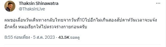 ล่าสุด นายทักษิณ ชินวัตร ทวีตข้อความผ่านทางทวิตเตอร์ Thaksin Shinawatra ประกาศเลื่อนวันกลับไทย ความว่า ผมขอเลื่อนวันเดินทางกลับไทยจากวันที่10 ส.ค.ไปอีกไม่เกิน 2 สัปดาห์ วันเวลาจะแจ้งอีกครั้ง หมอเรียกให้ไปตรวจร่างกายก่อนครับ