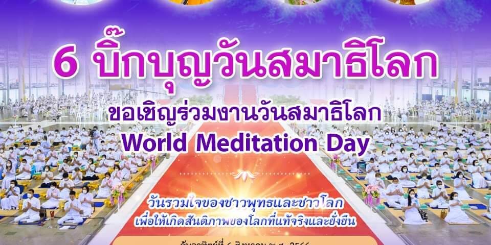 บรรยากาศที่วัดพระธรรมกายได้จัดกิจกรรมวันสมาธิโลก 6 บุญใหญ่ ประกอบด้วย 1.พิธีบูชาข้าวพระ 2.พิธีมุทิตาสักการะพระภิกษุผู้สอบได้เปรียญธรรม 9 ประโยค 3.พิธีมอบโล่เกียรติยศ ทุนการศึกษา และอุปกรณ์การเรียนแด่สำนักเรียนบาลีดีเด่นทั่วประเทศ จำนวน 109 แห่ง รวม 2.5 ล้านบาท 4.พิธีถวายมหาสังฆทานแด่คณะสงฆ์ 2,000 วัด 5.พิธีถวายไทยธรรมแด่คณะสงฆ์ 323 วัด 4 จังหวัดชายแดนภาคใต้ และ 6.พิธีมอบทุนช่วยเหลือครู 4 จังหวัดชายแดนภาคใต้ โดยมี พระเดชพระคุณพระพรหมวชิรปัญญาจารย์ ราชบัณฑิต เจ้าอาวาสวัดราชโอรสาราม ราชวรวิหาร หัวหน้าพระธรรมทูตสายที่ 8 เมตตาเป็นประธานสงฆ์ ท่ามกลางพุทธศาสนิกชนเข้าร่วมพิธีเป็นจำนวนมากที่สภาธรรมกายสากล วัดพระธรรมกาย