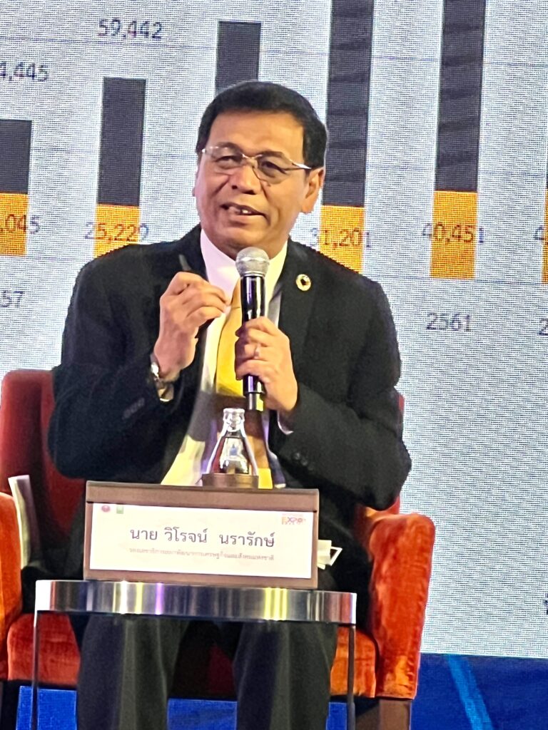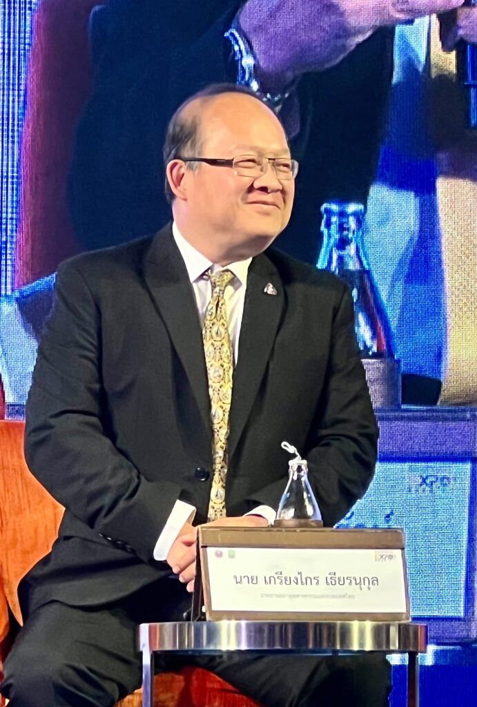 เช่นเดียวกับคุณเกรียงไกร เธียรนุกูล ประธานสภาอุตสาหกรรม ที่สะท้อนภาพความท้าทายของโลกยุคปัจจุบันที่มีการเปลี่ยนแปลงทางเทคโนโลยีอย่างรวดเร็วในลักษณะ Disruptive ทำให้อุตสาหกรรมหลายกลุ่มได้รับผลกระทบ สงครามการค้าระหว่างจีนและสหรัฐอเมริกา สงครามระหว่างรัสเซียกับยูเครน ทำให้ห่วงโซ่ต่างๆ เป็นปัญหา รวมถึงพลังงานที่มีราคาสูง จนถึงปัญหาโลกร้อนที่ทำให้ประเทศต่างๆ ต้องกำหนดนโยบาย Net zero สำหรับความท้าทายในประเทศ ได้แก่ ปัญหาความเชื่อมั่นในภาคอุตสาหกรรมขณะนี้ลดลงทุกด้าน การส่งออกติดลบ และประเทศไทยเป็นประเทศที่ติดอยู่กับกับดักรายได้ปานกลางมานานมากและใช้แรงงานเป็นหลัก ซึ่งหากยังเป็นอุตสาหกรรมแบบนี้เราจะไม่สามารถไปสู่ประเทศที่พัฒนาได้เลย ดังนั้น สภาอุตสาหกรรมจึงได้เตรียมปรับแผนการขับเคลื่อนภาคอุตสาหกรรมใหม่โดยเปลี่ยนวิธีคิดทำน้อยได้มาก ด้วยการใช้เทคโนโลยี เป็นอุตสาหกรรม Next Gen ที่จะมีทั้ง New S-Curve BCG โดยมีทิศทางเน้นด้านความยั่งยืน อุตสาหกรรมสีเขียวและสะอาดเป็นหลักสำคัญ