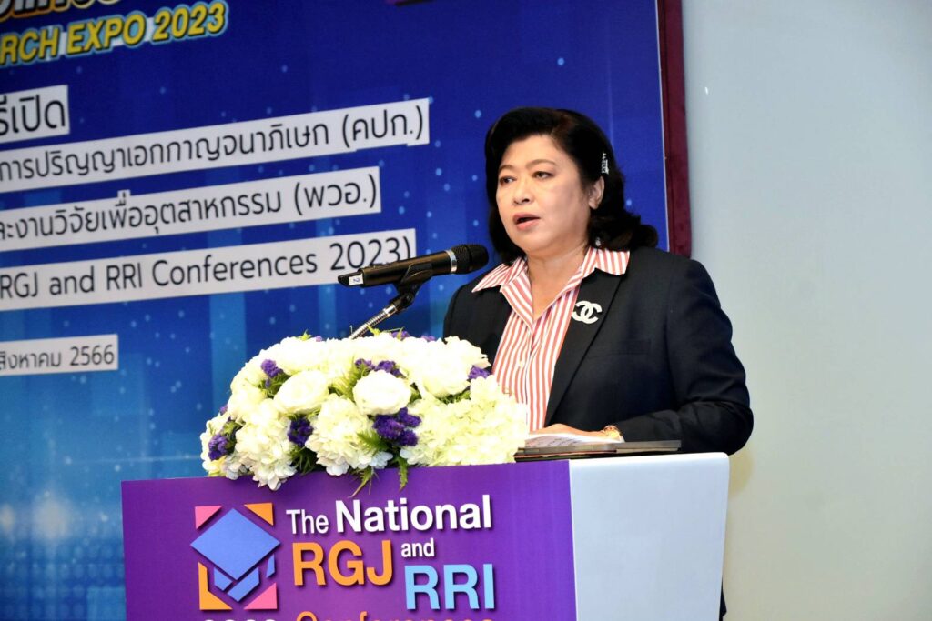 ดร.วิภารัตน์ ดีอ่อง กล่าวว่า (วช.) ภายใต้กระทรวง (อว.) เป็นหน่วยงานหลักในการบริหารทุนวิจัยและนวัตกรรมของประเทศ โดยมุ่งเน้นผลสำเร็จจากการวิจัยที่สามารถนำไปใช้ประโยชน์ในมิติต่างๆ เพื่อใช้เป็นกลไกในการพัฒนาและแก้ปัญหาเร่งด่วนสำคัญของประเทศ จึงจัดประชุมวิชาการระดับชาติ ภายใต้โครงการปริญญาเอกกาญจนาภิเษก (คปก.) และโครงการพัฒนางานวิจัยและนักวิจัยเพื่ออุตสาหกรรม (พวอ.) ประจำปี 2566 (The National RGJ and RRI Conferences 2023) เป็นอีกกิจกรรมหลักที่จะได้ร่วมกัน นำผลสำเร็จความรู้ความสามารถของนักวิจัย ที่จะเป็นนักวิจัยรุ่นใหม่ก้าวเข้าสู่แวดวงของการทำงานวิจัยคุณภาพสูงของประเทศต่อไปในอนาคต เป็นการพัฒนาเชิงผลสำเร็จจากการวิจัยและนวัตกรรม การพัฒนาบุคลากรการวิจัยถือว่าเป็นประเด็นเชิงเป้าหมายที่ทางกระทรวง (อว.) พร้อมด้วยส่วนที่เกี่ยวข้องกับแผน ววน. ให้ความสำคัญอย่างยิ่ง มีเป้าหมายในระยะต่อเนื่องมากกว่า 5 ปี ตั้งแต่ปี 2566 ถึง 2570 ยุทธศาสตร์ที่เกี่ยวข้องกับการพัฒนากำลังคนนักศึกษาที่เกี่ยวข้องกับการทำงาน เพื่อยกระดับความรู้ความสามารถให้ตรงกับความต้องการกับภาคผู้ประกอบการหรือในส่วนของมิติที่เกี่ยวข้องกับการพัฒนาประเทศ เรื่องการพัฒนาคนเป็นเรื่องสำคัญ กิจกรรมประจำปีนี้ ต้องการที่จะสร้างโอกาสสร้างเวที แสดงให้เห็นถึงความก้าวหน้าของการทำงานของนักวิจัยรุ่นเยาว์นักวิจัยรุ่นใหม่ ที่จะก้าวสู่แวดวงทางวิชาการ จากกลไกในเรื่องของทุน (คปก.) และ (พวอ.) ตรงนี้ (วช.) ร่วมกับ (สกสว.) และ เครือข่ายในการทำงานเรื่องการส่งเสริมวิจัยและนวัตกรรม มุ่งเน้นให้นักวิจัยได้เติบโตขึ้นตามสายอาชีพ นักวิจัยรุ่นเยาว์รุ่นใหม่รุ่นกลางแล้วก็เติบโตเป็นผู้เชี่ยวชาญในอนาคต ซึ่งในส่วนของนักวิจัยรุ่นเยาว์นี้ถือว่าเป็นฐานที่มี ความเข้มแข็งและก็มีความสำคัญในส่วนของทุน (คปก.) และ ทุน (พวอ.) แต่ละปีก็สามารถที่จะผลิตในส่วนของผู้ที่สำเร็จการศึกษาต่อเนื่อง ตั้งแต่ในช่วงที่ทาง (สกว.) ดูแลจนมาถึง (วช.) ได้รับช่วงการบริหารต่อ จะเห็นภาพของนักวิจัยที่พัฒนาผ่านการดูแล ของท่านอาจารย์ที่ปรึกษาในแต่ละสาขาวิชา การสำเร็จการศึกษาแล้วก็เข้าสู่แวดวงประชาคมวิจัย ในการทำงานตามความเชี่ยวชาญในแต่ละสาขา ซึ่งตรงนี้เองเป็นส่วนของการต่อยอดความรู้ ที่ได้จากการประชุมทางวิชาการที่จัดขึ้นในช่วงมหกรรมงานวิจัยแห่งชาติในครั้งนี้ เป็นส่วน หนึ่งในการเสริมสร้างความเข้าใจและสร้างประสบการณ์ที่ดี ผลงานมากกว่า 180 ผลงาน นำเสนอผ่านการประชุมระดับชาติ oral presentation โปสเตอร์พรีเซนเทชันอีก 70 ผลงาน ลัก