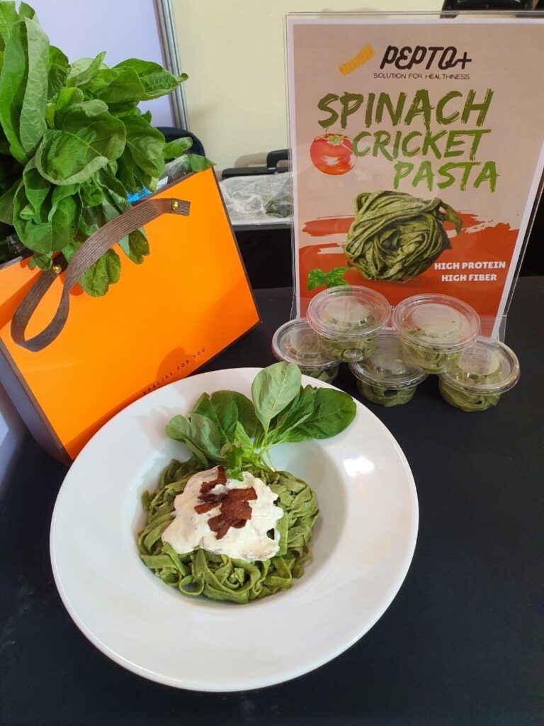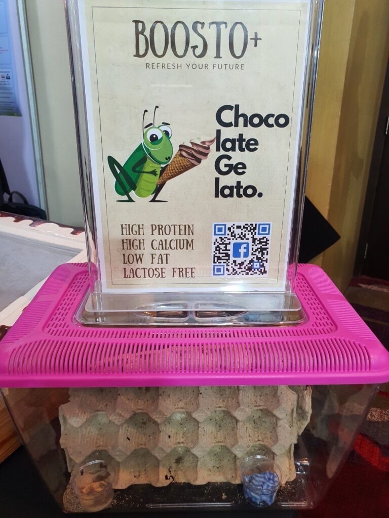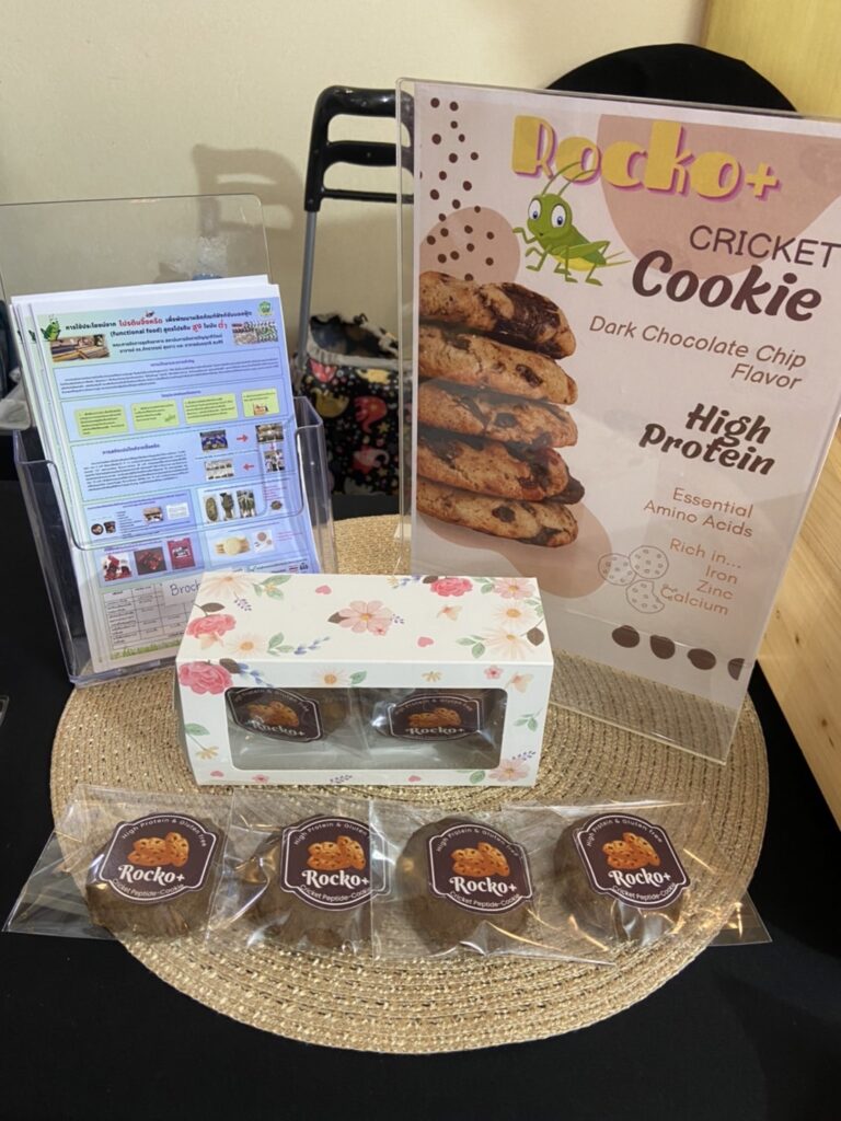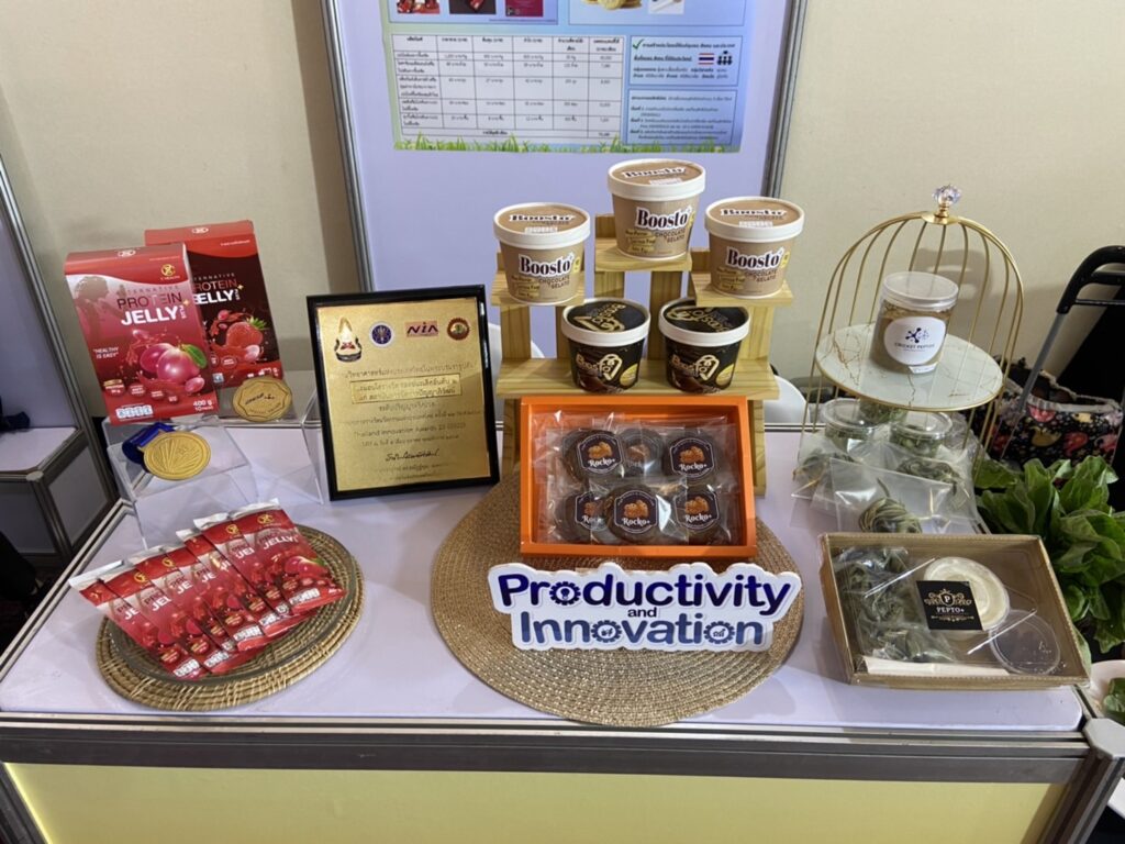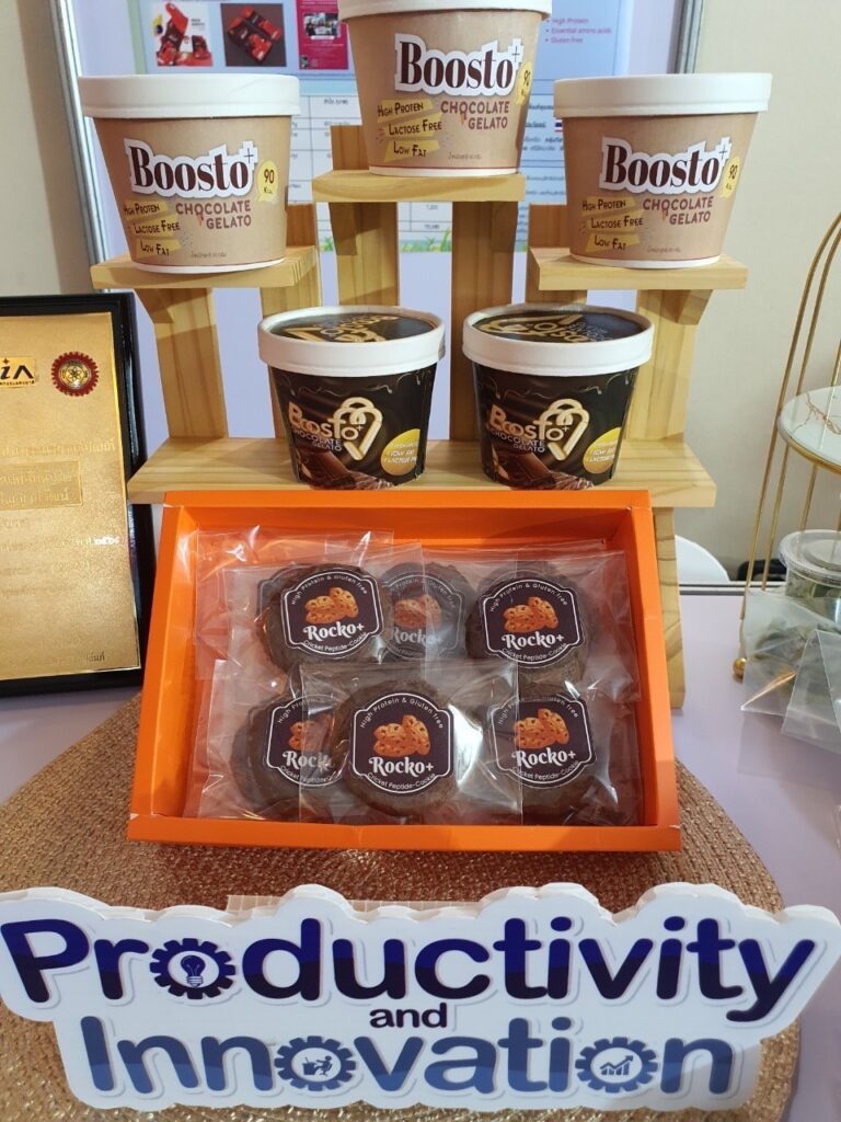 ดร.ภัทราภรณ์ สุขขาว หัวหน้าโครงการวิจัย เปิดเผยว่า จากเทรนด์อาหารแห่งอนาคตโปรตีนจากแมลงได้รับความนิยมสูง จิ้งหรีดมีปริมาณโปรตีนสูงมากกว่า 70% ซึ่งเป็นแหล่งโปรตีนทางเลือกที่น่าสนใจ โครงการวิจัยนี้มีการนาเปปไทด์ที่สกัดได้มาใช้เป็นส่วนผสมในผลิตภัณฑ์ไอศกรีมเสริมโปรตีนจากจิ้งหรีด (Boosto+) ซึ่งเป็นนวัตกรรมไอศกรีมชนิดใหม่ ที่มีโปรตีนสูง ไขมันต่ำ ใช้สารให้ความหวาน ทาจากนมอัลมอนด์ สูตรแลคโตสฟรีผลิตภัณฑ์เส้นพาสต้า ผลิตภัณฑ์คุกกี้ และผลิตภัณฑ์เจลลี่เสริมโปรตีนจากจิ้งหรีด ดังนั้นงานวิจัยนี้จึงเป็นการสร้างมูลค่าเพิ่มด้วยการสกัดโปรตีนจากจิ้งหรีด การสร้างรายได้ให้แก่เกษตรกร ชุมชน และประเทศชาติ ทำให้ได้ส่วนผสมที่มีคุณค่าทางโภชนาการสูง สามารถตอบโจทย์ผู้บริโภคที่รักสุขภาพได้อย่างแท้จริง