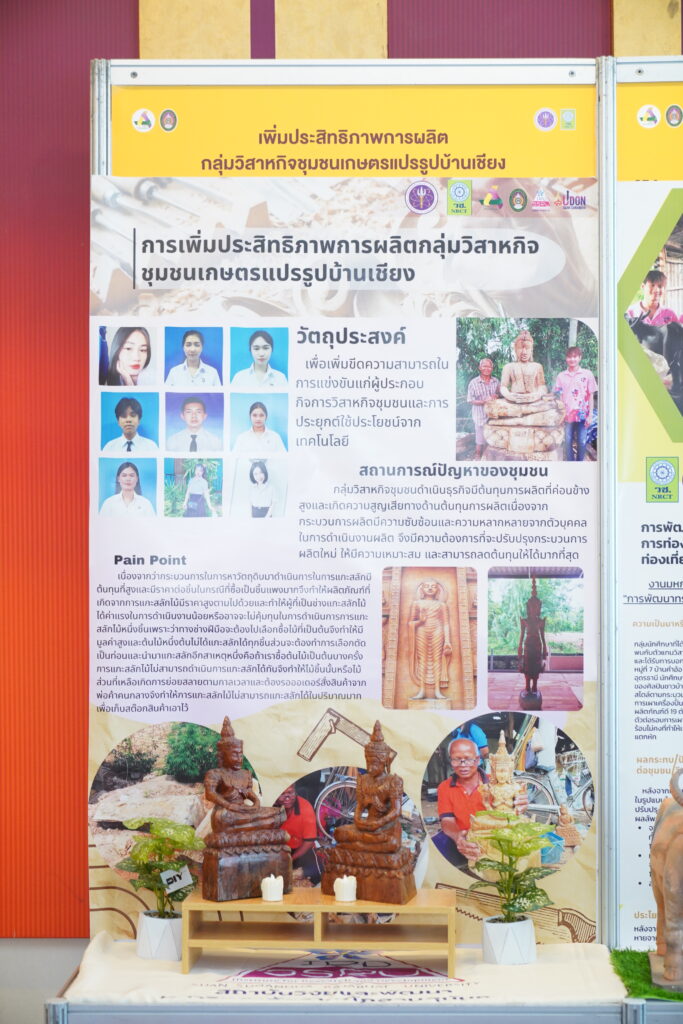 บ้านเชียง” ผลงานเรื่อง “การลดต้นทุนกระบวนการผลิตผ้าพื้นเมืองวิสาหกิจชุมชนผ้าพื้นเมืองบ้านเชียง” ผลงานเรื่อง “การพัฒนาผลิตภัณฑ์เพื่อยกระดับผลิตภัณฑ์ของวิสาหกิจชุมชนบ้านเชียง” และผลงานเรื่อง “การพัฒนาเส้นทางท่องเที่ยวเพื่อการท่องเที่ยววิถีไทพวน” โดยมี นายศุภษิต ทิพย์วดีศิทธ์ นาย ตรีเพชร พุ่มเจริญดี นางสาวสมิตา อาสาคะติ นางสาววรรณพร เวชสิทธิ์ นายอามีน อาบู นายพีรวัฒน์ ตุ้ยแป้ นายปัญญวัฒน์ รองไชย