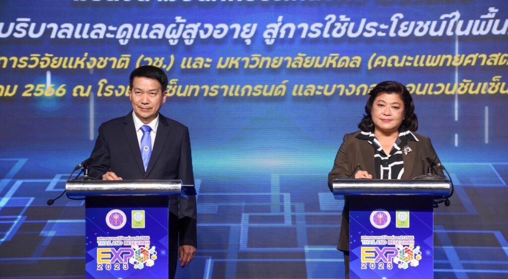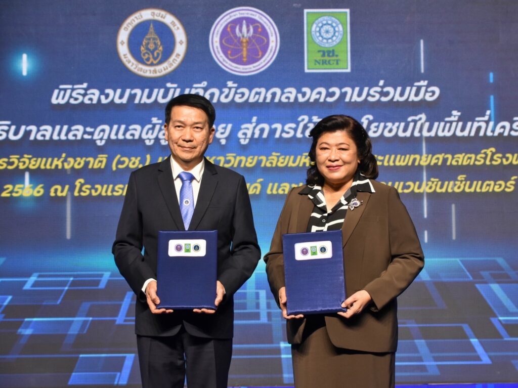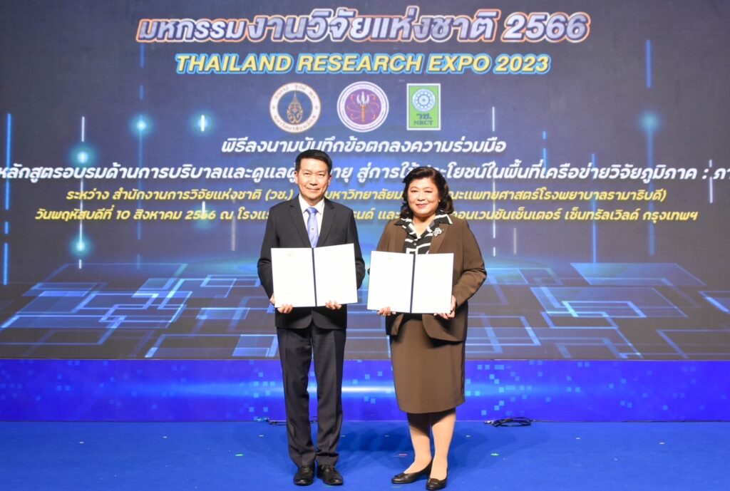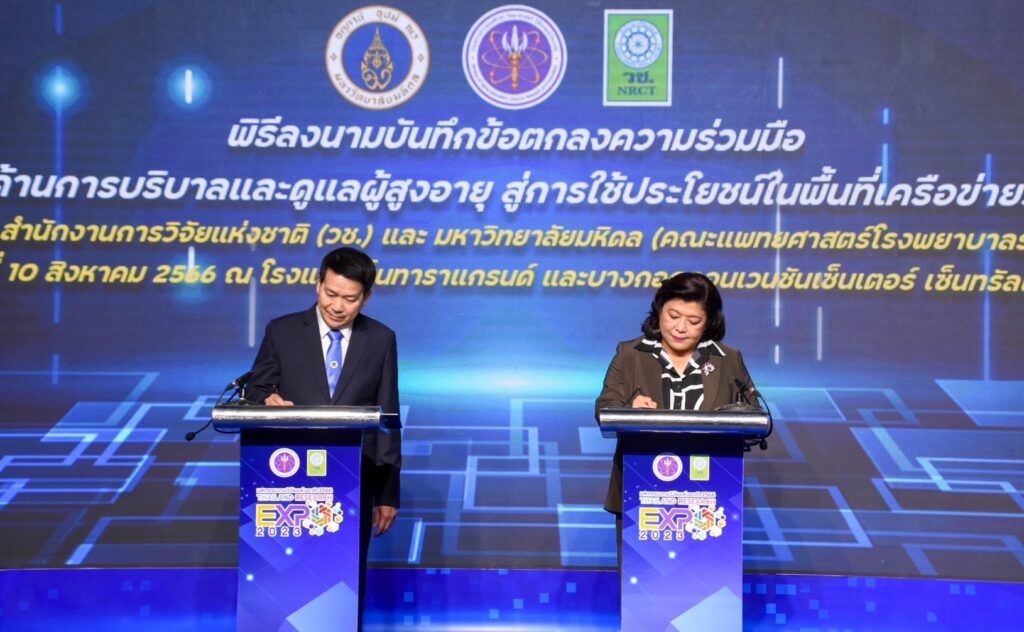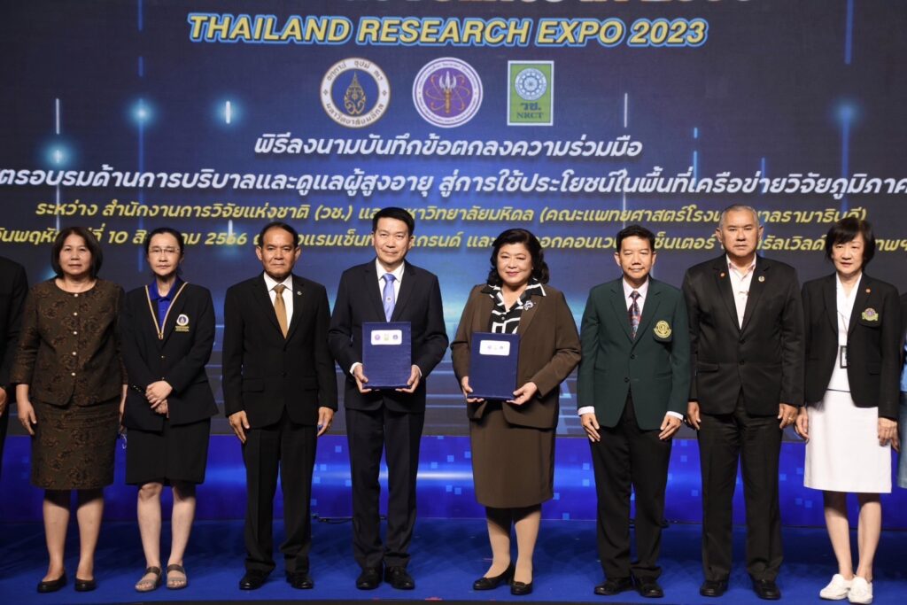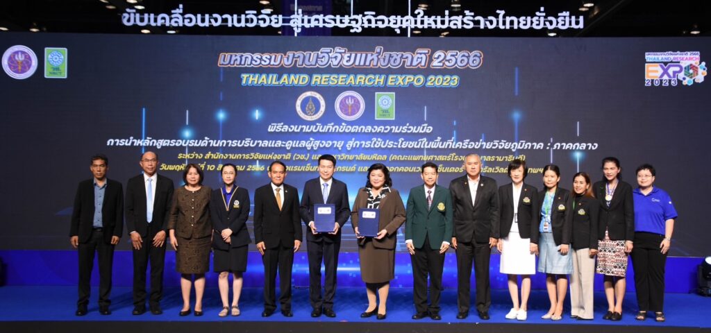 เมื่อวันที่ 10 สิงหาคม 2566 : กระทรวงการอุดมศึกษา วิทยาศาสตร์ วิจัยและนวัตกรรม (อว.) โดย สำนักงานการวิจัยแห่งชาติ (วช.) และ คณะแพทยศาสตร์โรงพยาบาลรามาธิบดี มหาวิทยาลัยมหิดล จัดพิธีลงนามบันทึกข้อตกลงความร่วมมือ “การนำหลักสูตรการอบรมด้านการบริบาลและดูแลผู้สูงอายุ สู่การใช้ประโยชน์ในพื้นที่เครือข่ายวิจัยภูมิภาค : ภาคกลาง” เพื่อมุ่งยกระดับการดูแลและบริบาลผู้สูงอายุให้มีสุขภาวะและคุณภาพชีวิตที่ดี โดยมี ดร.วิภารัตน์ ดีอ่อง ผู้อำนวยการสำนักงานการวิจัยแห่งชาติ (ผอ.วช.) และ ศ.นพ.ปิยะมิตร ศรีธรา คณบดีคณะแพทยศาสตร์โรงพยาบาลรามาธิบดี มหาวิทยาลัยมหิดล ร่วมลงนาม พร้อมนี้ คณะผู้บริหาร (วช.) ผู้บริหารคณะแพทยศาสตร์โรงพยาบาลรามาธิบดี คณะกรรมการเครือข่ายวิจัยภูมิภาค เข้าร่วมพิธีฯ และเป็นสักขีพยานการลงนามความร่วมมือในครั้งนี้ ณ เวที Highlight Stage โรงแรมเซ็นทาราแกรนด์และบางกอกคอนเวนชันเซ็นเตอร์ เซ็นทรัลเวิลด์ กรุงเทพฯ