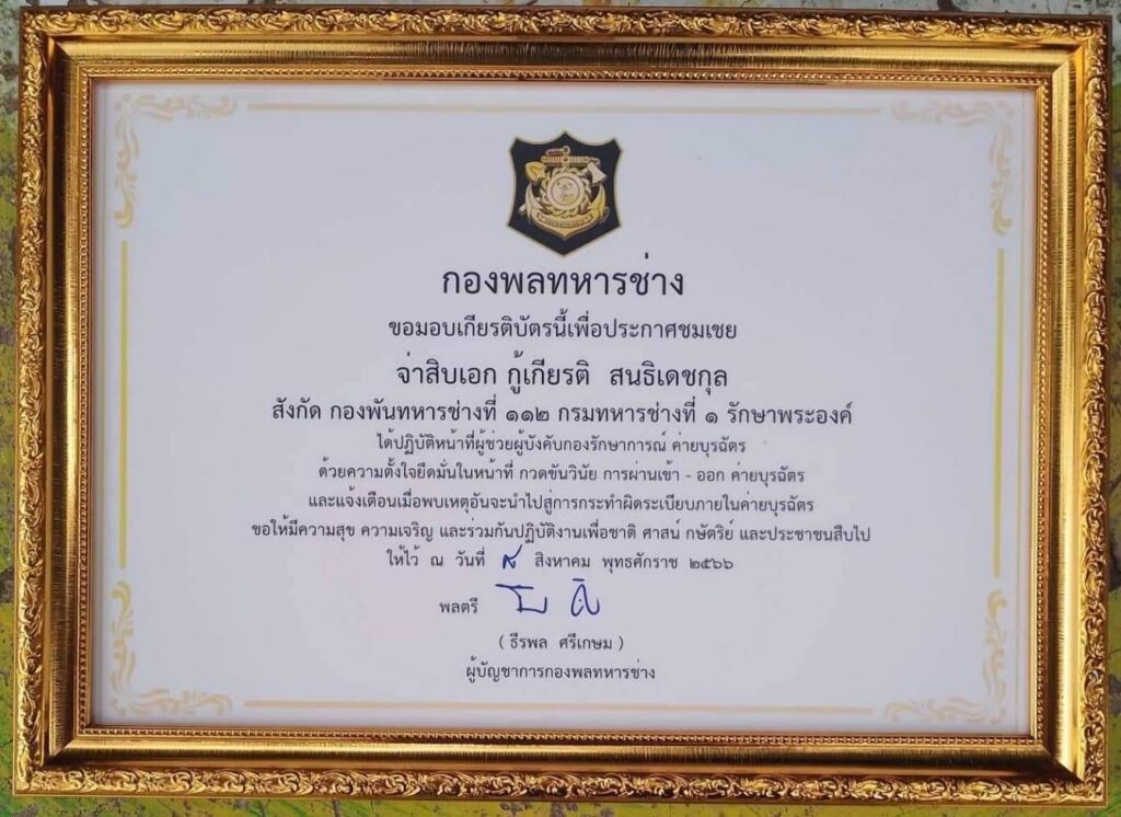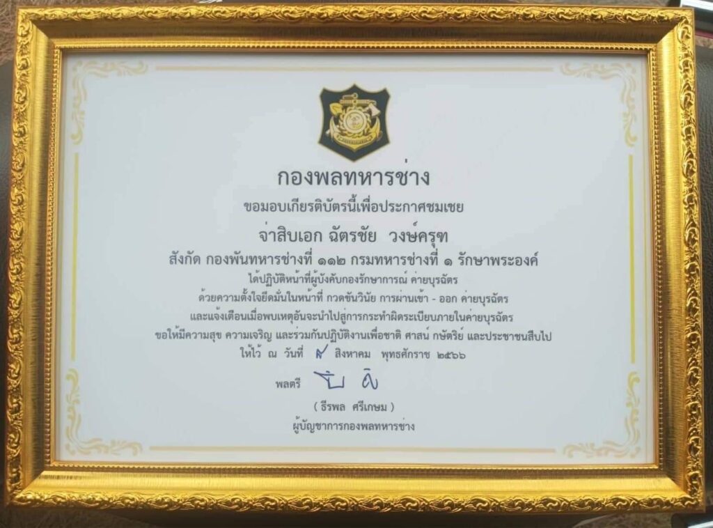 ผู้บัญชาการกองพลทหารช่าง มอบประกาศยกย่องชมเชย ให้แก่ ร.ต.วินัย โพธิบุตร ,จ.ส.อ. ฉัตรชัย วงษ์ครุฑ และ จ.ส.อ. กู้เกียรติ สนธิเดชกุล กำลังพล ทั้ง 3 นาย สังกัด ช.1 พัน.112 รอ. ได้ปฏิบัติหน้าที่นายทหารเวรค่ายบุรฉัตร ,ผบ. และ รอง ผบ.กองรักษการณ์ ค่ายบุรฉัตร ตามลำดับ ในระหว่างปฏิบัติหน้าที่ ทั้ง 3 นาย มีความมุ่งมั่นตั้งใจ ทำการกวดขันวินัย และแจ้งเตือนผู้บังคับบัญชาเมื่อพบเหตุอันจะนำไปสู่การกระทำผิดระเบียบภายในค่ายบุรฉัตร