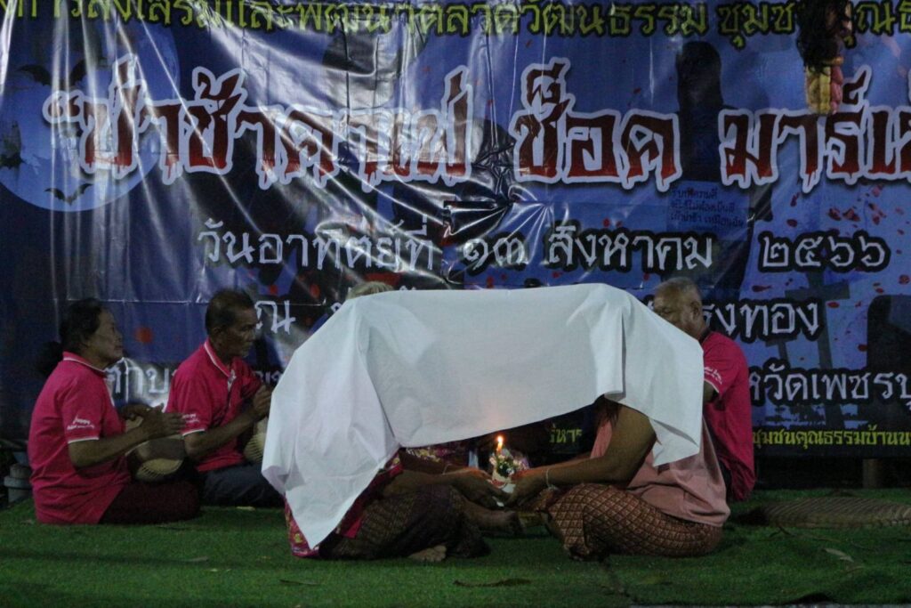 นางยุวดี มีบุญ วัฒนธรรมจังหวัดเพชรบูรณ์ กล่าวว่า การจัดตลาด”ป่าช้าคาเฟ่ ช้อค มาร์เก็ต” ครั้งที่2 ถือเป็นโครงการส่งเสริมและพัฒนาตลาดวัฒนธรรม ชุมชนคุณธรรมบ้านนายม เป็นโครงการต้นแบบส่งเสริม ในการสนับสนุนเครือข่ายชุมชนคุณธรรมในการอนุรักษ์ สืบสาน ศิลปะ วัฒนธรรมของชุมชน พัฒนาต่อยอดสร้างเศรษฐกิจฐานราก ส่งเสริมภาพลักษณ์ของชุมชนด้วยSoft Powerซึ่งสอดคล้องกับนโยบาย “เที่ยวชุมชน ยลวิถี”โดยการนำทุนทางวัฒนธรรม ในพื้นที่มาพัฒนาต่อยอดสร้างรายได้ เศรษฐกิจฐานรากและเพื่อบูรณาการ ความร่วมมือของทุกภาคส่วนโดยใช้มิติทางวัฒนธรรม โดยภายในงานchek in มีบริการแต่งหน้าสไตล์ (ร่วมทำบุญ รายได้ให้กับชุมชน) ซึ่งมีผู้ให้ความสนใจสลับสับเปลี่ยนมาแต่งหน้าผีกันอย่างคึกคักโดยเฉพาะเด็กๆต่างสนุกสนานที่ได้แต่งหน้าผีเที่ยวงาน รวมทั้งผู้ปกครองพาลูกหลานมาชิมอาหารพื้นเมือง จิบกาแฟ แลโอ่ง ตื่นใจกับเมนูผีผีทั้งกาแฟและอาหาร- ขนมพื้นบ้านอาหาร เช่น ผีลงหลุม (ขนมครก) ตานีเปลื้องผ้า(หมกหยวกกล้วย) อสูรกายใต้ดิน (หมกหน่อไม้) แม่โพสพ อยู่ไฟ ถ่ายภาพร่วมกับเหล่าผีผี ทีมมัคคุเทศน์น้อย และเยาวชนของชุมชน การสาธิต การสกรีนเสื้อ ถุงผ้า กระเป๋า “ป่าช้า คาเฟ่” โดยคณะวิทยากร จากมหาวิทยาลัยราชภัฎเพชรบูรณ์ การจัดร้านจำหน่ายผลิตภัณฑ์วัฒนธรรมไทย(CPOT) และผลิตภัณฑ์วัฒนธรรมชุมชนไทย (CCPOT)