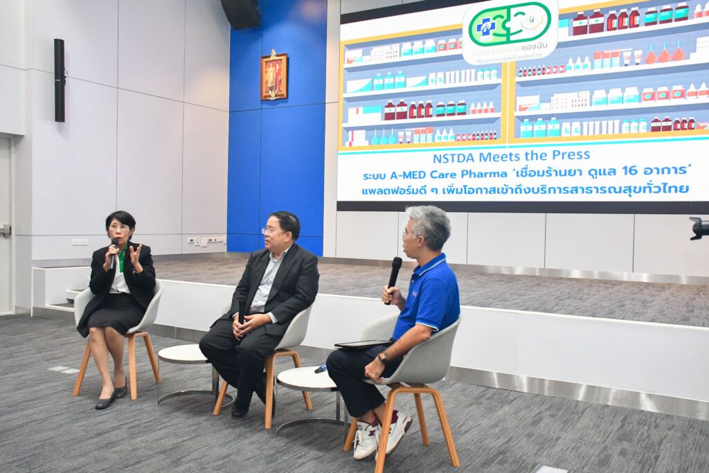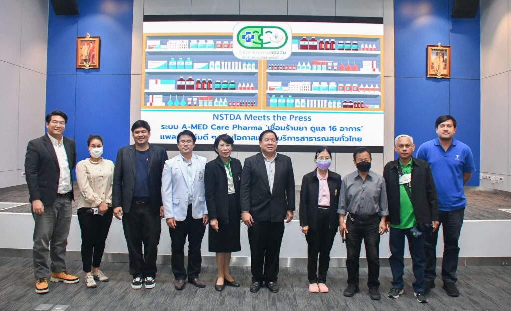 เมื่อวันที่ 16 สิงหาคม 2566 ณ สำนักงานพัฒนาวิทยาศาสตร์และเทคโนโลยีแห่งชาติ (สวทช.) อาคารโยธีนำโดย ดร.กิตติ วงศ์ถาวราวัฒน์ ผู้อำนวยการกลุ่มแพลตฟอร์มบริการทางการแพทย์ดิจิทัล (Digital Healthcare Platform) สำนักงานพัฒนาวิทยาศาสตร์และเทคโนโลยีแห่งชาติ (สวทช.) พร้อมด้วยทีมวิจัย A-MED (สวทช.) และ ภญ.เพ็ญทิพา แก้วเกตุทอง ผู้อำนวยการสำนักงานรับรองร้านยาคุณภาพ สภาเภสัชกรรม เปิดสัมภาษณ์พิเศษในกิจกรรม NSTDA Meets the Press เรื่อง ระบบ A-MED Care Pharma บริการ ‘เชื่อมร้านยา ดูแล 16 อาการ’ แพลตฟอร์มดีๆ เพิ่มโอกาสเข้าถึงบริการสาธารณสุขทั่วไทย โดยเทคโนโลยี A-MED Care แพลตฟอร์มหลังบ้านในการบริหารจัดการ การเบิกจ่ายค่ารักษาพยาบาลตามสิทธิบัตรทอง เพื่อสนับสนุนการทำงานของสำนักงานหลักประกันสุขภาพแห่งชาติ (สปสช.) และสภาเภสัชกรรม หนึ่งในบริการของแพลตฟอร์มบริการทางการแพทย์ดิจิทัล ซึ่งเป็น Core Business ของ (สวทช.) โดยมุ่งเป้าใช้นวัตกรรมแก้ไขปัญหาเรื่องความแออัดของหน่วยบริการสาธารณสุข ช่วยประชาชนเข้าถึงการรักษาอย่างทั่วถึงและเท่าเทียม