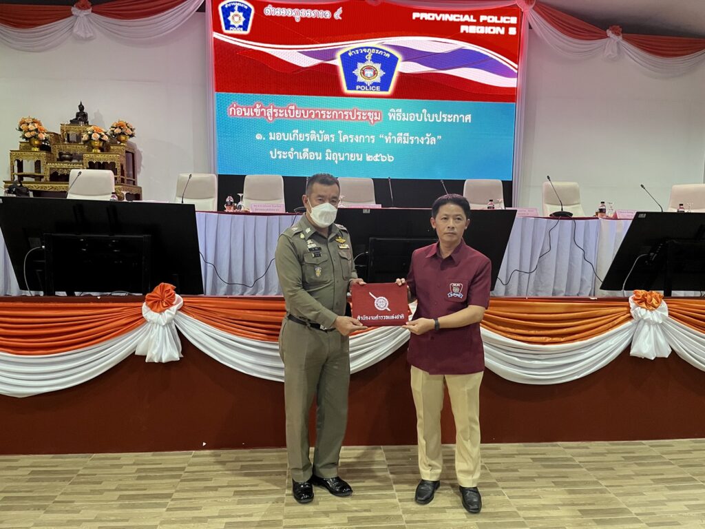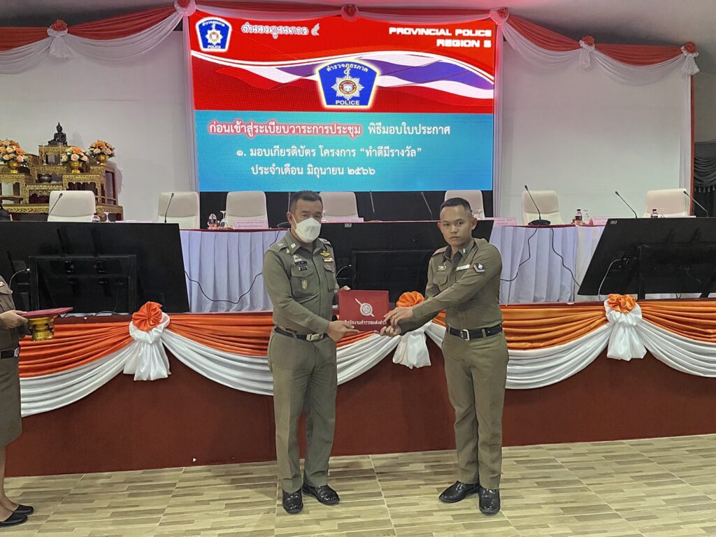 พร้อมกันนี้ พล.ต.ท.ปิยะ ต๊ะวิชัย ได้มอบเกียรติบัตร โครงการทำดีมีรางวัล ประจำเดือน มิ.ย. ให้แก่