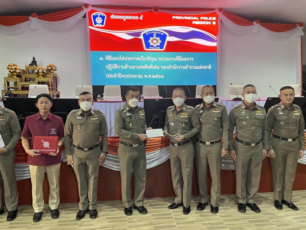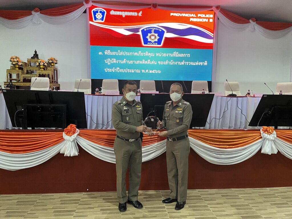มอบโล่ประกาศเกียรติคุณหน่วยงาน ที่มีผลการปฏิบัติงานด้านการปราบปรามยาเสพติดดีเด่น ประจำปีงบประมาณ พ.ศ.2566 โดย พล.ต.ต.พฤทธิพงษ์ ประยูรศิริ รอง ผบช.ภ.5 เป็นตัวแทน ภ.5 รับมอบ