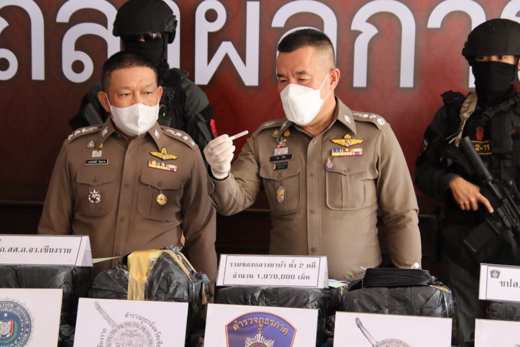 วันที่ 21 สิงหาคม 2566 เวลา 10.30 น. ตำรวจภูธรภาค 5 โดย พล.ต.ท.ปิยะ ต๊ะวิชัย ผบช.ภ.5 ,พ.ต.อ.พิทักษ์ นาสมวาส รอง ผบก.สส.ภ.5 ,พ.ต.อ.พงษ์สวัสดิ์ ไชยบาล รอง ผบก.ภ.จว.เชียงราย และ นายธันวา ผุดผ่อง นักวิเคราะห์นโยบายและแผนเชี่ยวชาญ สำนักงาน ป.ป.ส.ภาค 5 ได้ร่วมกันแถลงผลการจับกุมการปฏิบัติของชุดปราบปรามยาเสพติดตำรวจภูธรจังหวัดเชียงราย ที่ทำการจับกุมคดียาเสพติดรายสำคัญจำนวน 2 คดี สามารถจับกุมผู้ต้องหาได้ 1 คดี ตรวจยึดยาบ้ารวมเกือบ 2 ล้านเม็ด ตรวจยึดรถยนต์จำนวน 2 คัน