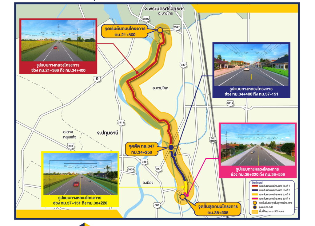 การจัดประชุมในครั้งนี้ บริษัทที่ปรึกษาโครงการฯ ได้นำเสนอแนวคิดเบื้องต้นในการพัฒนาโครงการ โดยมีรายละเอียดต่าง ๆ ดังนี้ สำหรับแนวเส้นทางโครงการฯ มีจุดเริ่มต้นบริเวณทางหลวงหมายเลข 3309 ประมาณ กม.21+800 ถนนเป็นผิวทางแอลฟัลท์ ขนาด 2 ช่องจราจร จากนั้นประมาณ กม.34+188 แนวทางหลวงโครงการถูกทางหลวงหมายเลข 347 (ปทุมธานี-บางปะหัน) ตัดผ่านโดยจะเชื่อมกับทางคู่ขนานของทางหลวงหมายเลข 347 จากนั้นแนวทางหลวงโครงการไปตัดทางพิเศษอุดรรัถยา (บางปะอิน-ปากเกร็ด) ประมาณ กม.37+700 และไปสิ้นสุดโครงการที่ทางแยกจุดตัดทางหลวงหมายเลข 346 (ถนนรังสิต-ปทุมธานี) ประมาณ กม.38+558 ในพื้นที่อำเภอเมือง จังหวัดปทุมธานี ระยะทางรวมประมาณ 16.80 กิโลเมตร